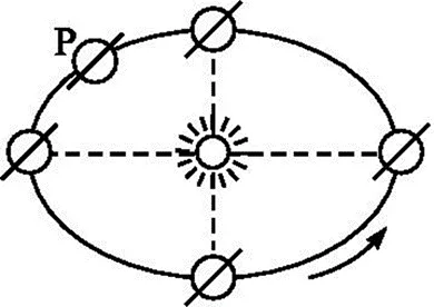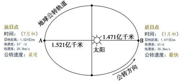 教师展示幻灯片,结合幻灯片讲解知识。 【教师讲解】 地球绕太阳的运动,叫作地球的公转。 同地球自转方向一致,地球公转的方向也是自西向东。 地球公转一周的时间是1年。如果以太阳作为参照物,1年的时间长度为365日5时48分46秒,称为回归年。 如果以其他恒星作为参照物,1年的时间长度为365日6时9分10秒,称为恒星年,这是地球公转的真正周期。 板书: 4.轨道 【问题】 地球公转时的近日点和远日点各在什么时间? 公转速度有什么不同? (请同学预习教材后回答) 教师展示幻灯片,结合幻灯片讲解知识。 【教师讲解】地球公转的轨迹叫作公转轨道,它是近似正圆的椭圆轨道,太阳位于椭圆的一个焦点上。 每年的1月初,地球距离太阳最近,这个位置叫近日点;每 年的7月初,地球距离太阳最远,这个位置叫远日点。 随着地球的公转,日地距离不断地发生细微的变化,地球公转的速度也随之发生变化。 具体如下图所示: