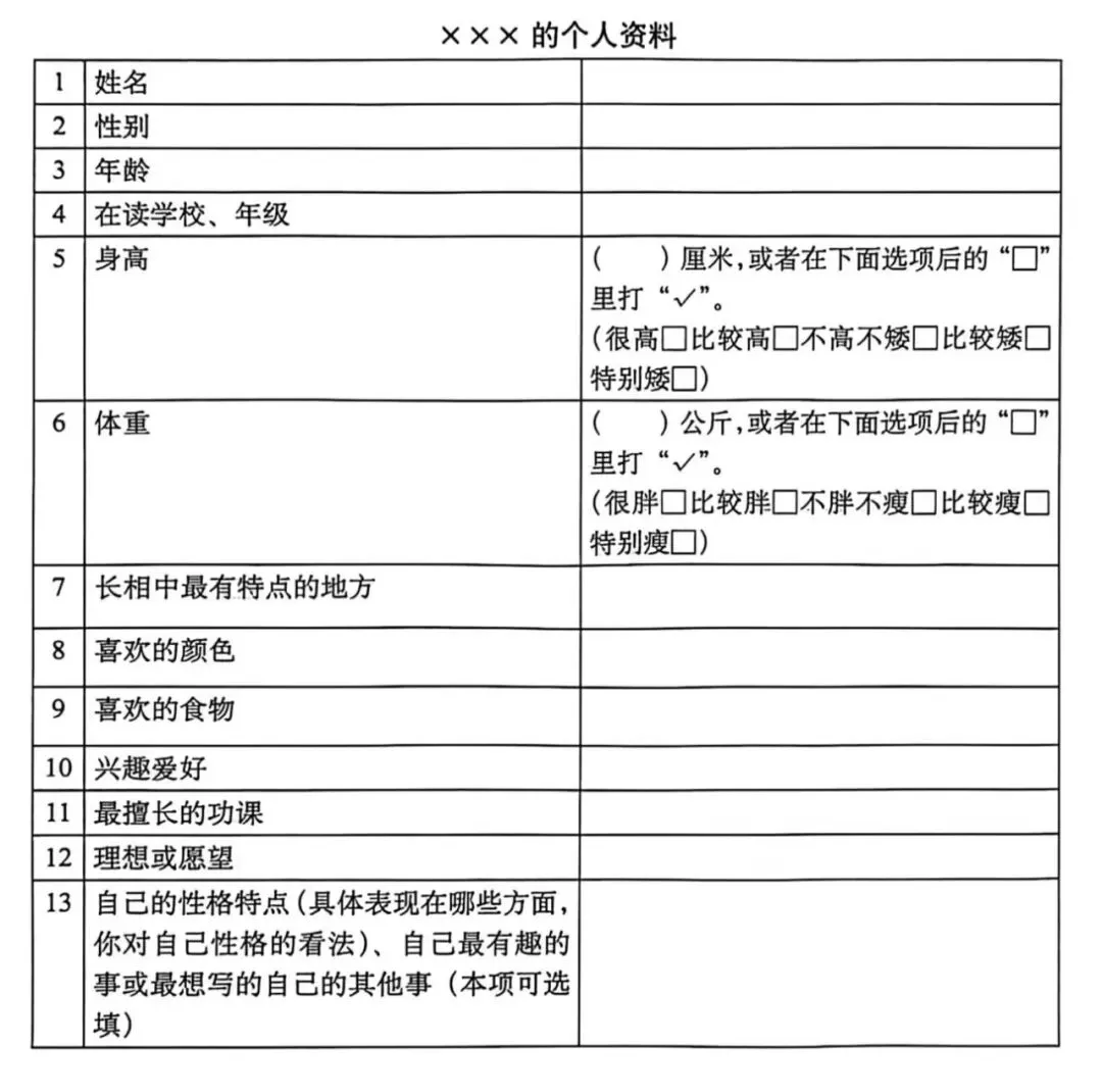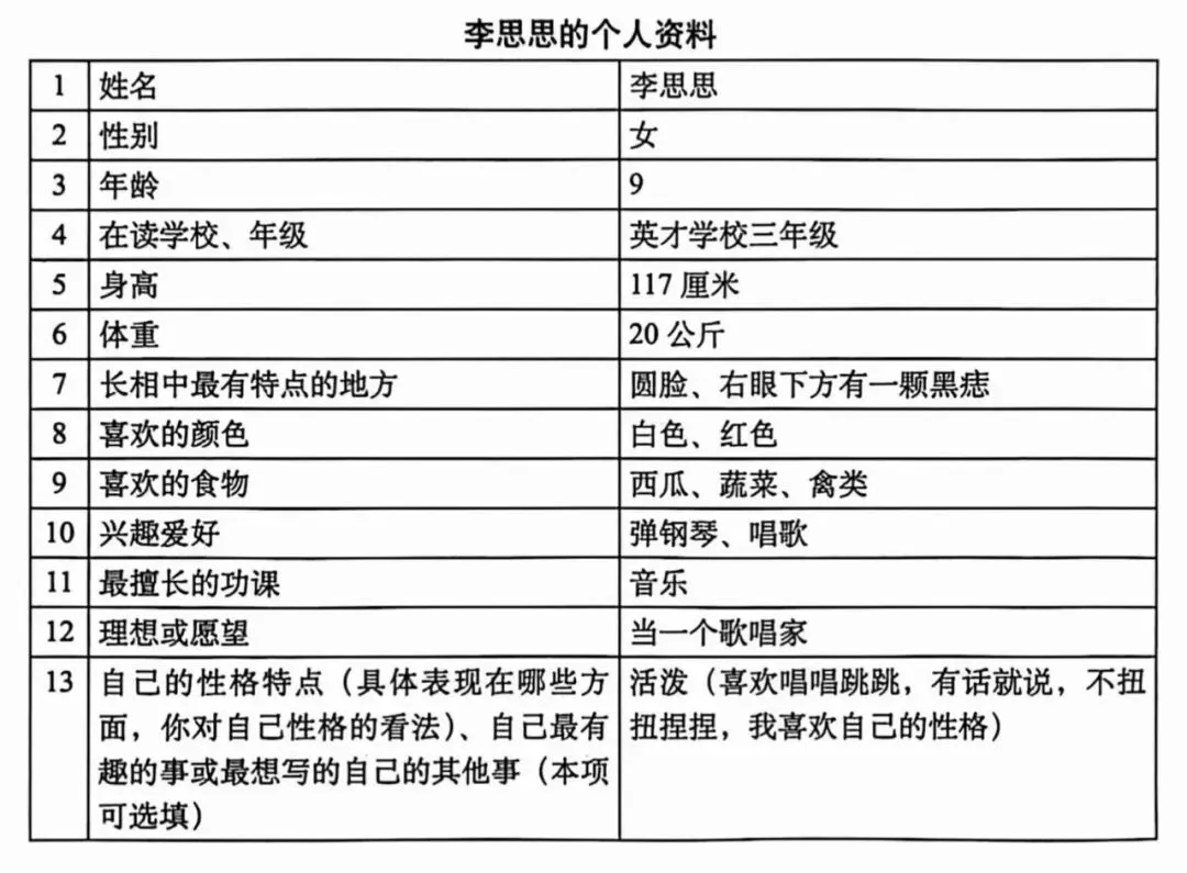 还要注意,一定要将表格里面的话变成我们日常说话的形式,如李思思同学在作文中就将"姓名:李思思"变成了"我叫李思思",将"性别:女"变成了"是个女孩",将"年龄:9岁"变成了"今年9岁",将"在读学校、年级:英才学校三年级"变成了"在英才学校上三年级"。