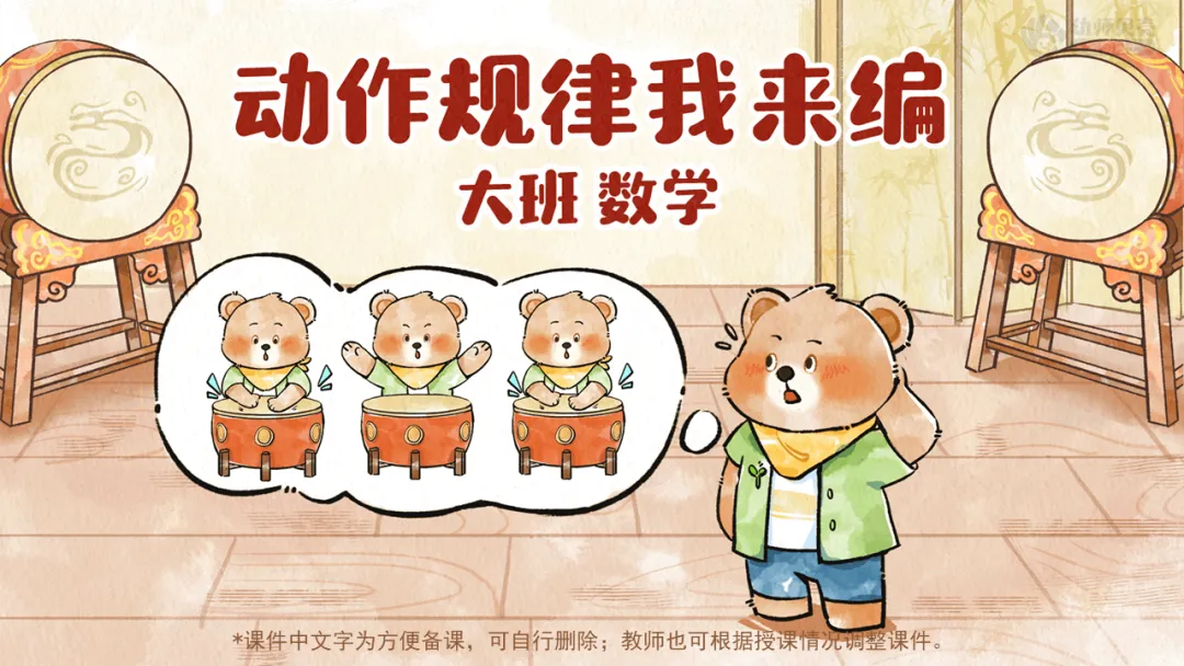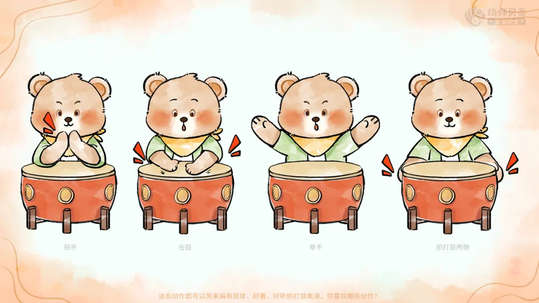 ——经过这几次的练习,小熊慢慢学会了打鼓,现在它想让小朋友们为它编一套好看并且有规律的打鼓动作。你们愿意帮助他吗?