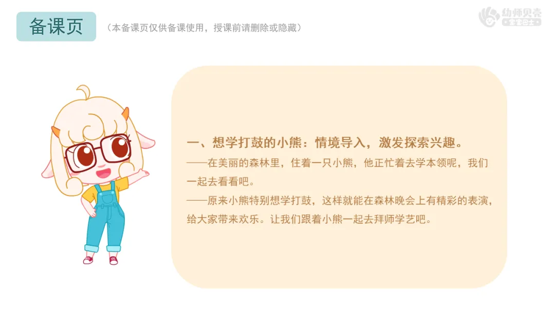 一、想学打鼓的小熊:情境导入,激发探索兴趣。