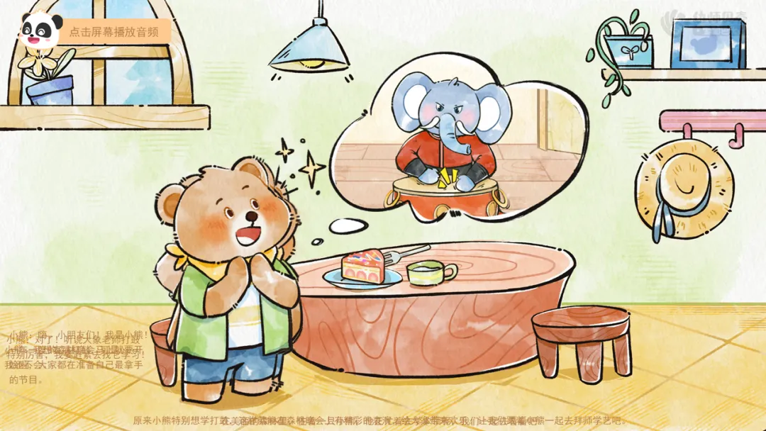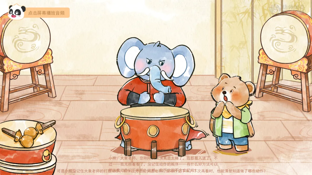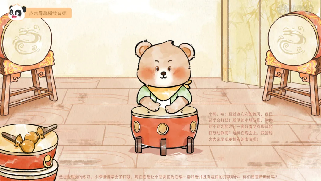 ——原来小熊特别想学打鼓,这样就能在森林晚会上有精彩的表演,给大家带来欢乐。让我们跟着小熊一起去拜师学艺吧。