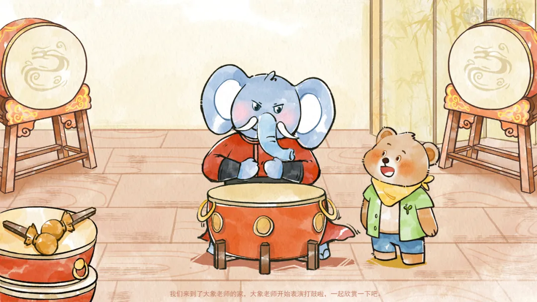 ——我们来到了大象老师的家,大象老师开始表演打鼓啦,一起欣赏一下吧。