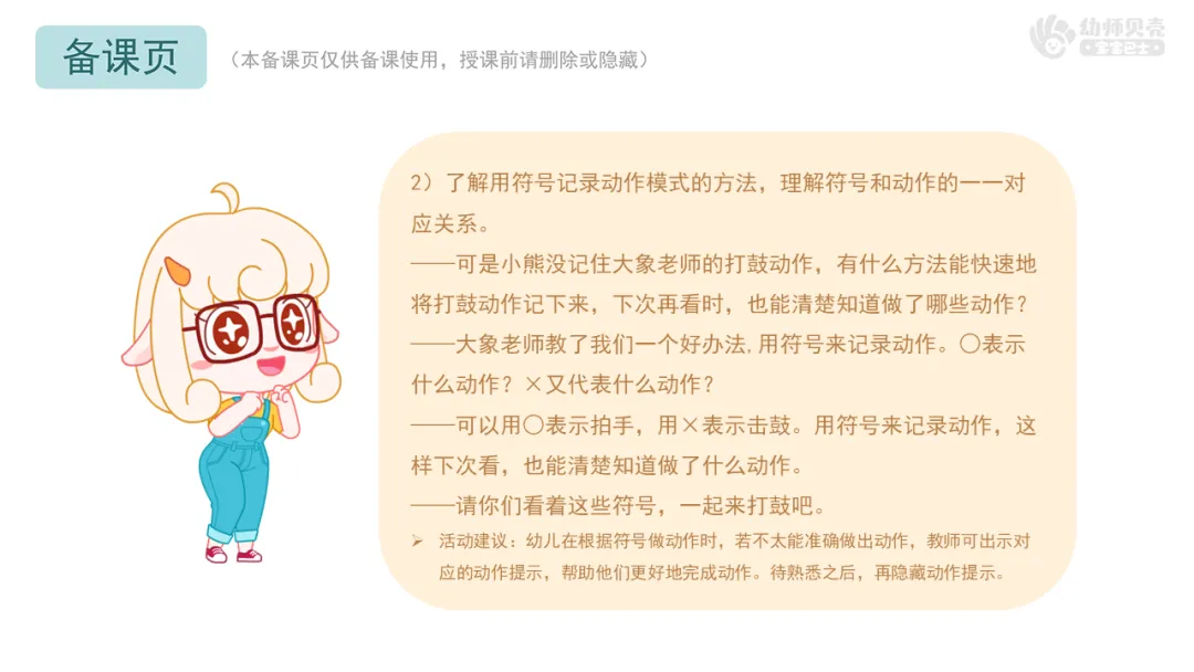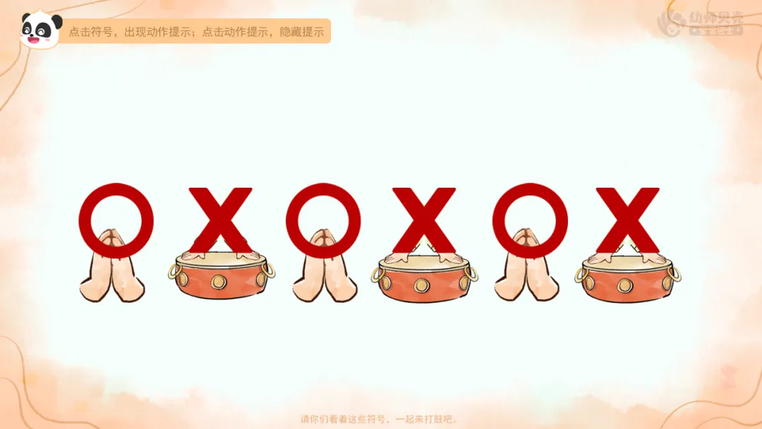 ——我们可以用符号来记录动作,这样下次看,也能清楚知道做了什么动作。可以用○表示拍手,用×表示击鼓。