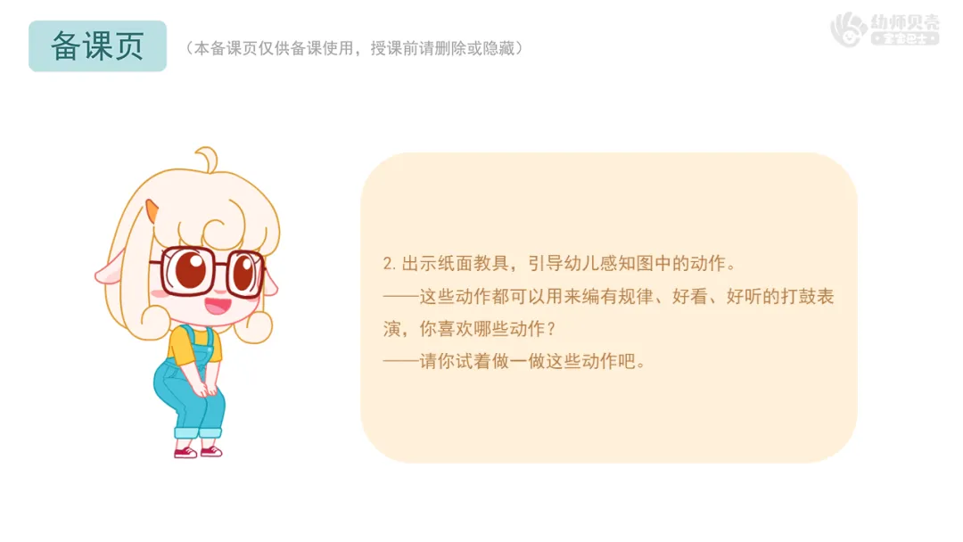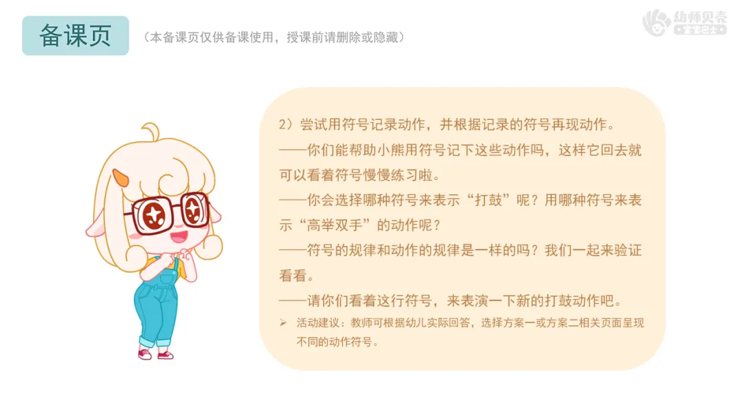 Ø活动建议:教师可根据幼儿实际回答,选择方案一或方案二相关页面呈现不同的动作符号。