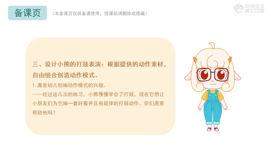 三、设计小熊的打鼓表演:根据提供的动作素材,自由组合创造动作模式。