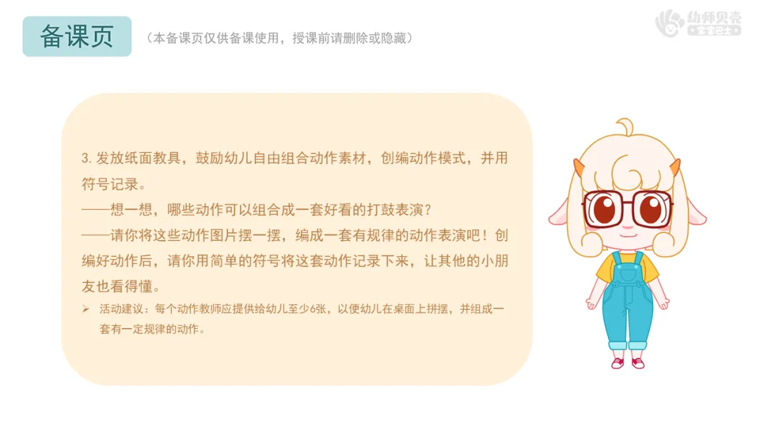 Ø活动建议:1.简单的符号记录是为后续的创编动作,提供了一个可视化的工具,便于幼儿在创编动作中保持规律性。2.在后续练习打鼓时,有条件的教师可准备鼓槌、小鼓,鼓励幼儿用鼓槌敲打鼓面代替用双手击鼓动作。若条件不允许,教师也可让幼儿用双手敲击桌面、椅面、腿部动作等,替换双手击鼓动作。