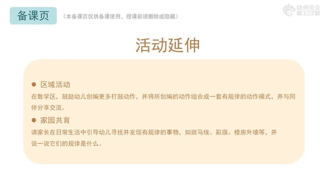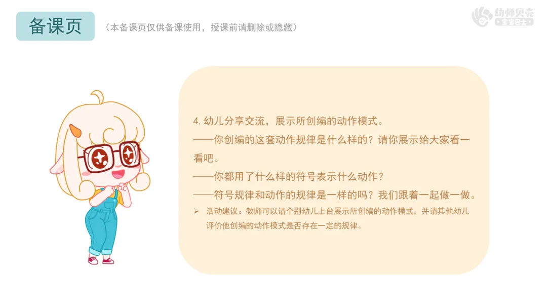 Ø活动建议:教师可以请个别幼儿上台展示所创编的动作模式,并请其他幼儿评价他创编的动作模式是否存在一定的规律。
