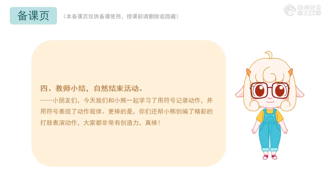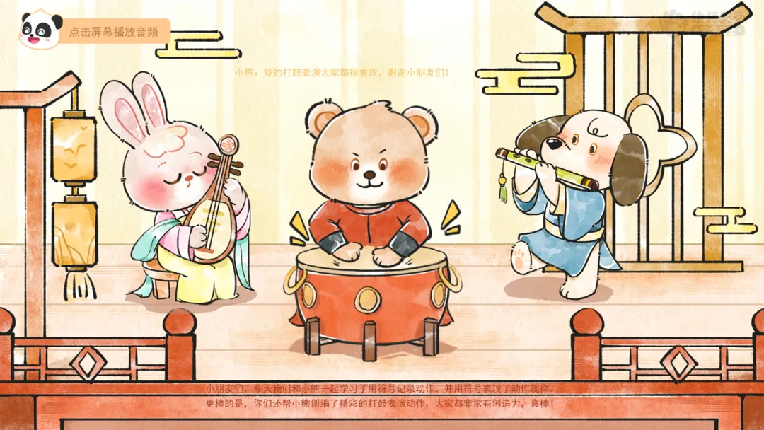 ——小朋友们,今天我们和小熊一起学习了用符号记录动作,并用符号表现了动作规律。更棒的是,你们还帮小熊创编了精彩的打鼓表演动作,大家都非常有创造力,真棒!