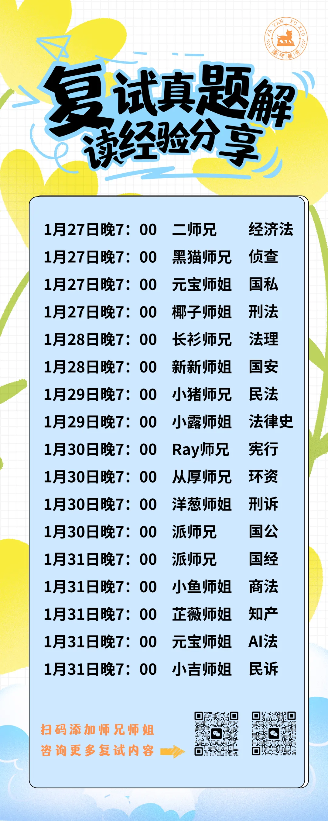 从1月26日到1月31日,17场直播覆盖18个专业,高分上岸的师兄师姐将从复试讲义如何使用、复试笔面试的区别、复试真题出题范围和备考方向等方面全方位帮你轻松应对复试环节!