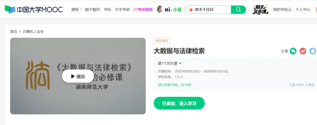另外,中国大学MOOC《大数据与法律检索》第十一期即将结课关闭,还没有选课的同学可抓紧时间选课。结课关闭后,没有选课的同学将不能观看,已要选课的同学还可继续学习课程视频。