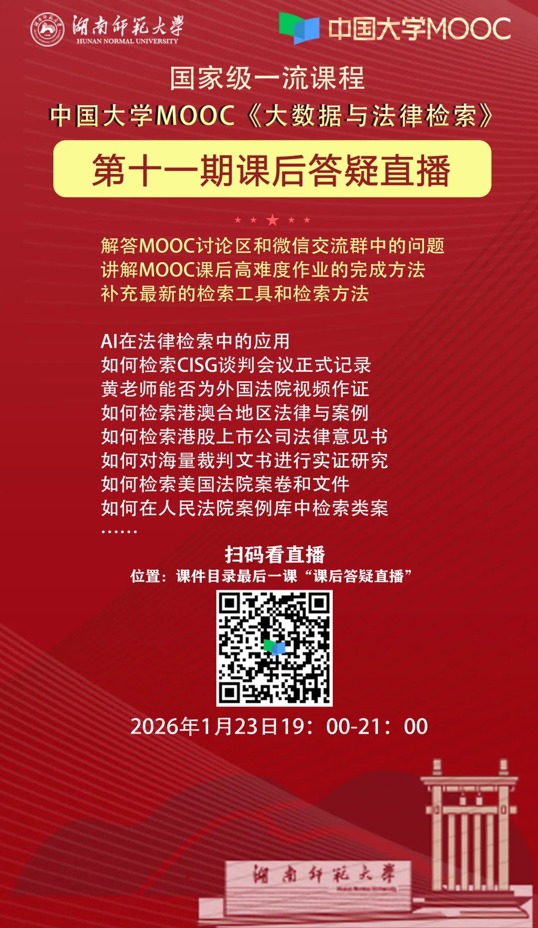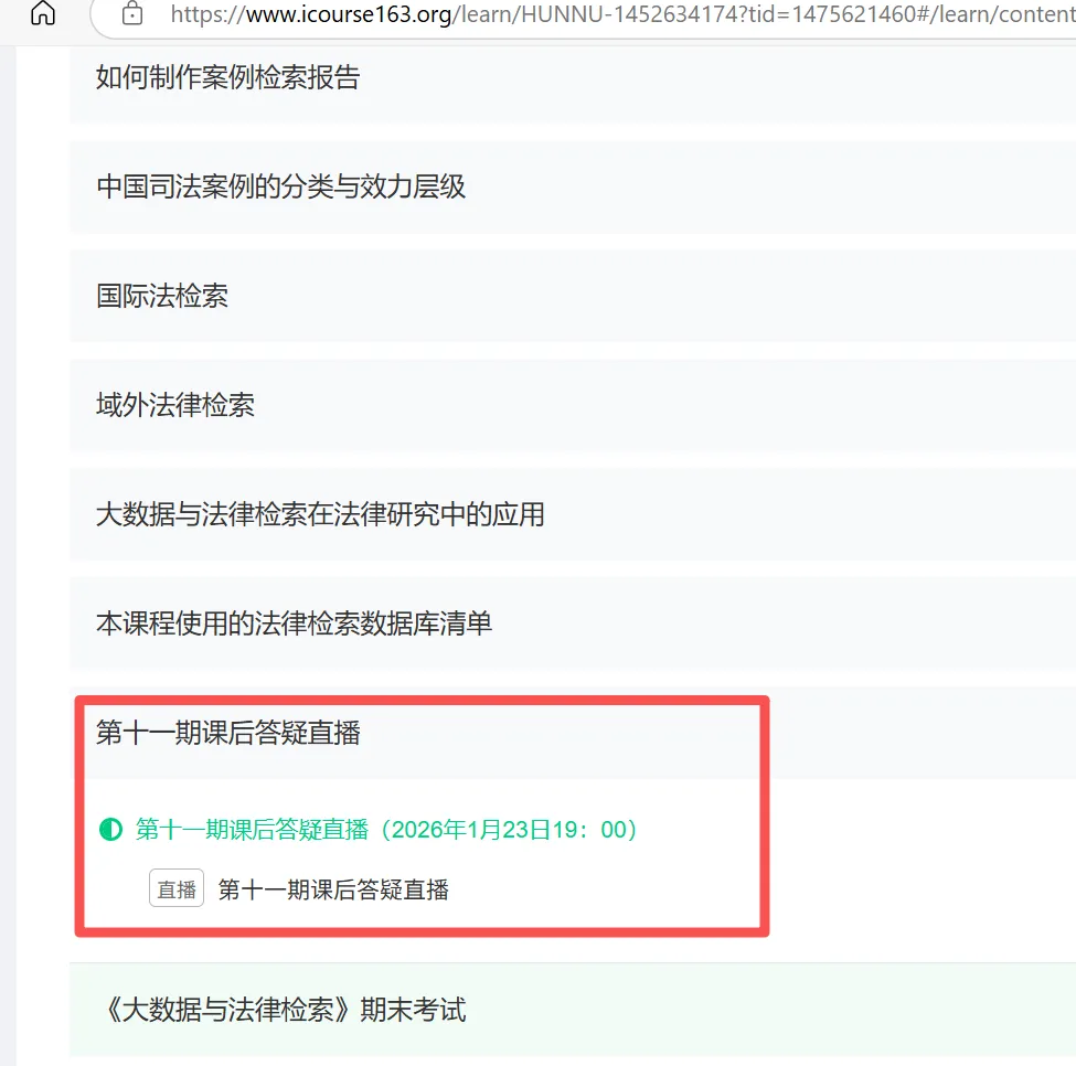 2026年1月23日19:00,中国大学MOOC《大数据与法律检索》主讲人黄文旭老师在课程平台做了一次课后答疑直播,集中解答了课程讨论区和慕课微信群同学们提出的问题,讲解了有难度的作业的完成方法,并补充了一些新的检索技巧,内容包括: