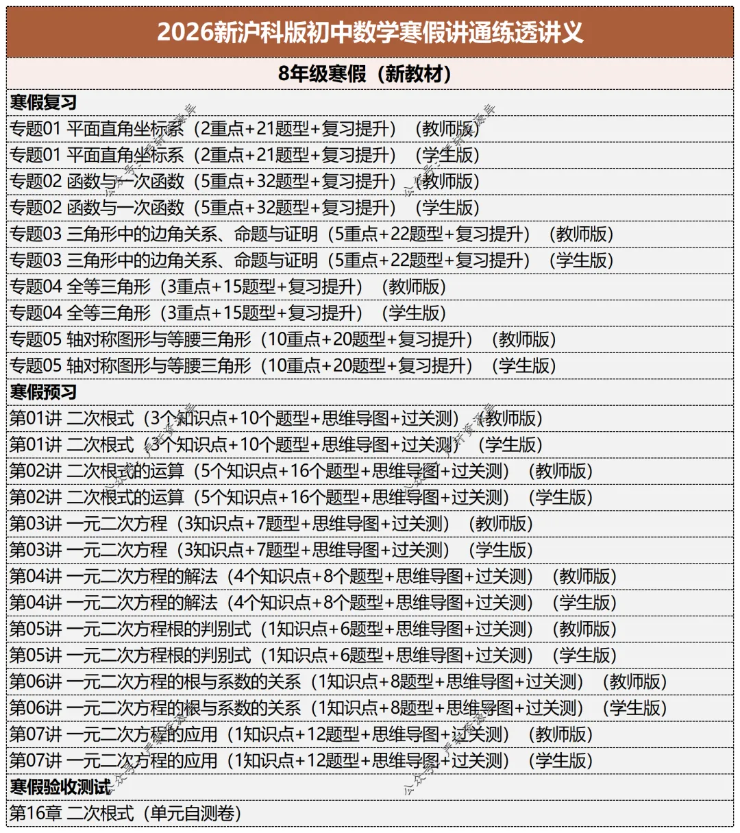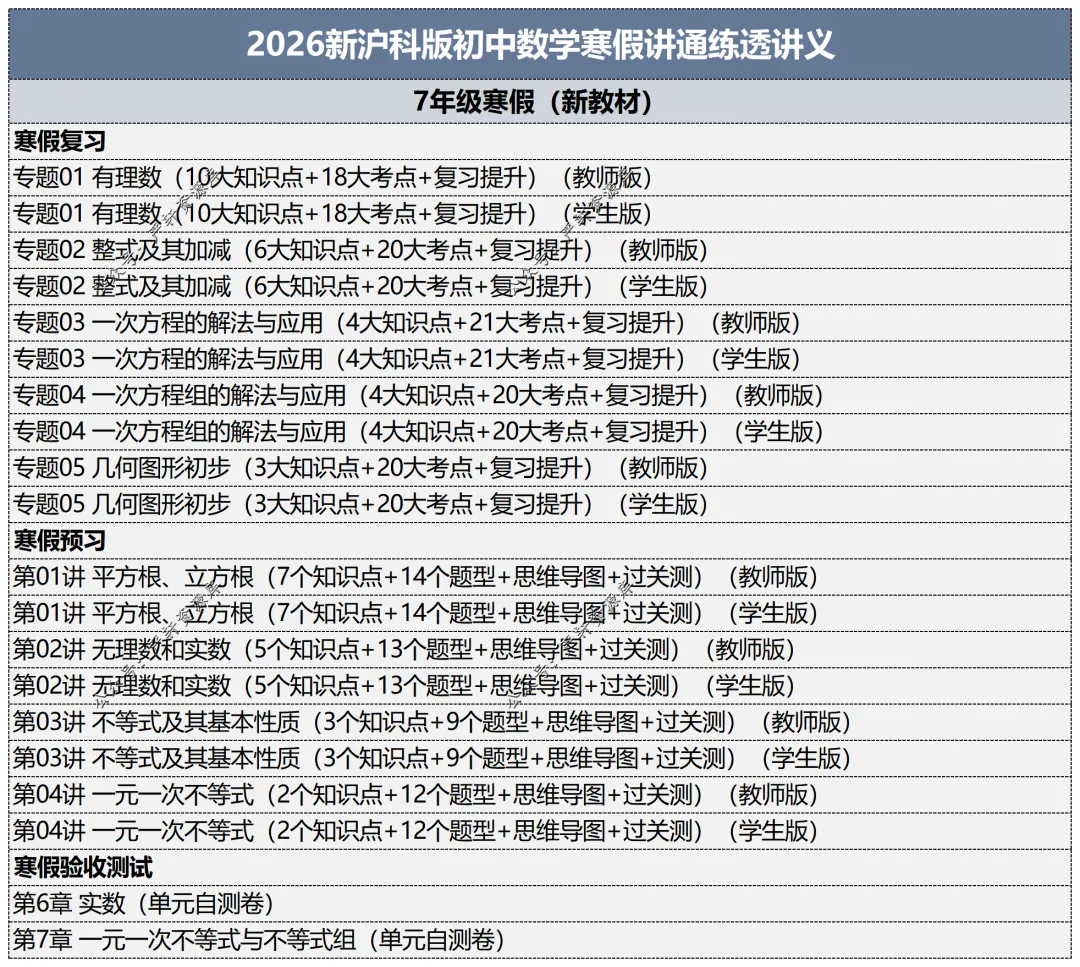 小编今日分享:2026初中数学寒假讲通练透讲义(新沪科版)