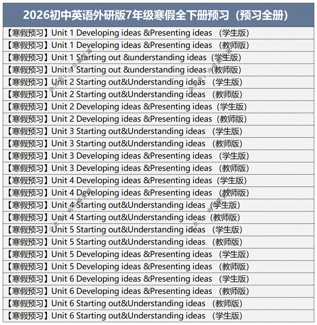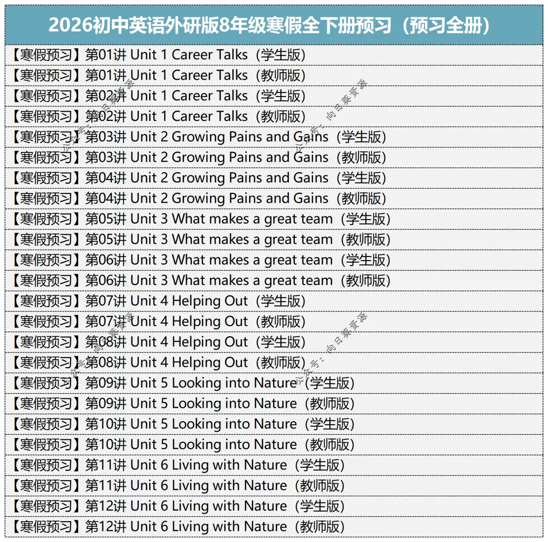 【3】2026初中英语外研版8年级寒假全下册预习(预习全册)U1-U6,单词预习、课文详解、语法突破、当堂检测。