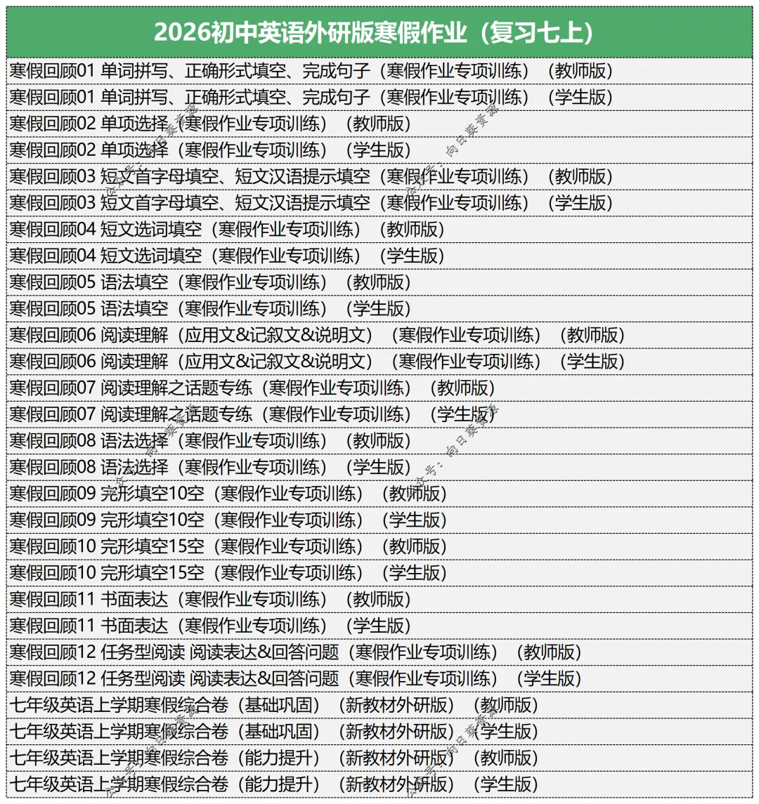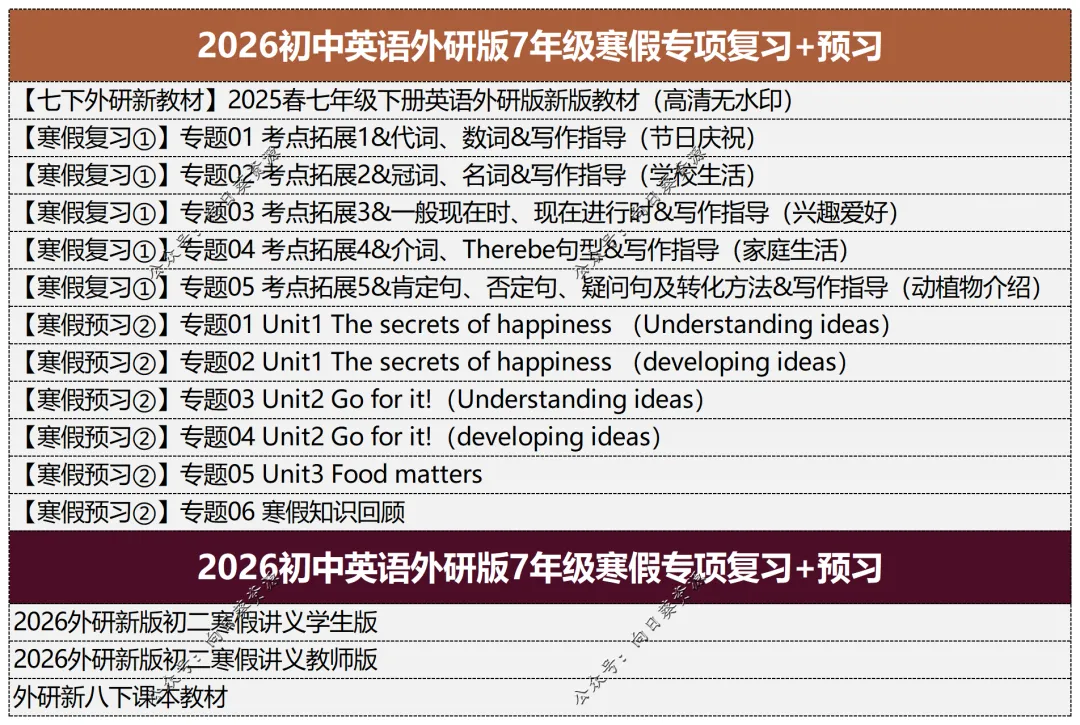 【2】2026初中英语外研版7年级寒假专项复习5专题+预习6专题,预习前三个单元到期中。