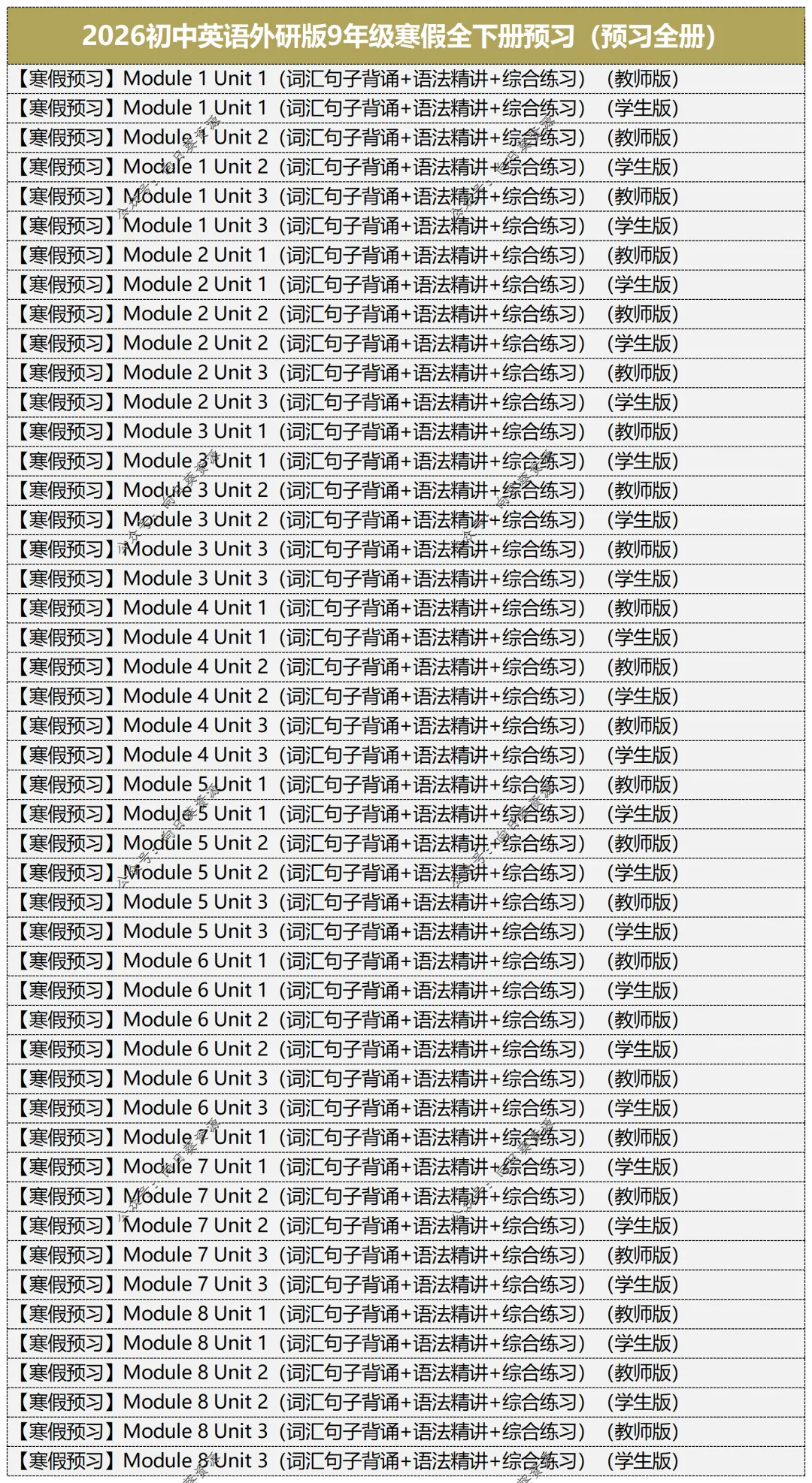 【5】2026初中英语外研版9年级寒假全下册预习(预习全册)Module 1-8,目标导航、知识精讲、分层练习。
