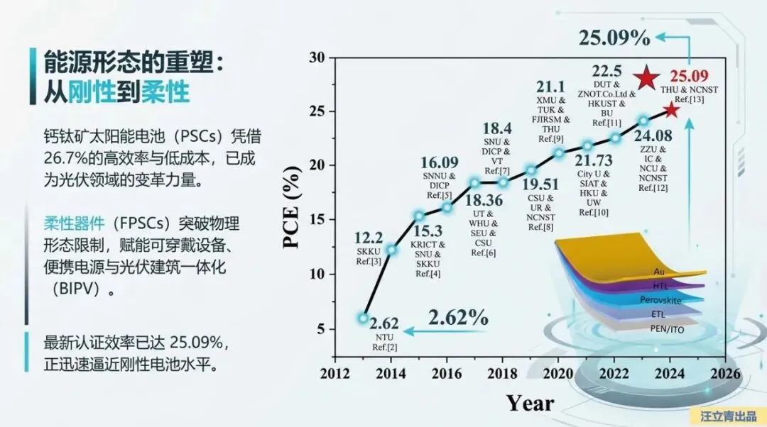 这份课件综述了柔性钙钛矿太阳能电池(FPSCs)的研究进展、面临的挑战及未来发展方向。FPSCs因其高光电转换效率(目前最高已达25.09%)、轻质、柔性可弯曲以及低成本制造等优势,在可穿戴设备和便携式电源等领域展现出巨大的应用潜力,,。