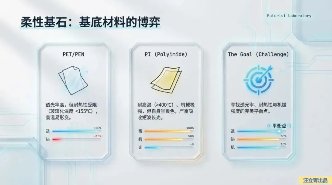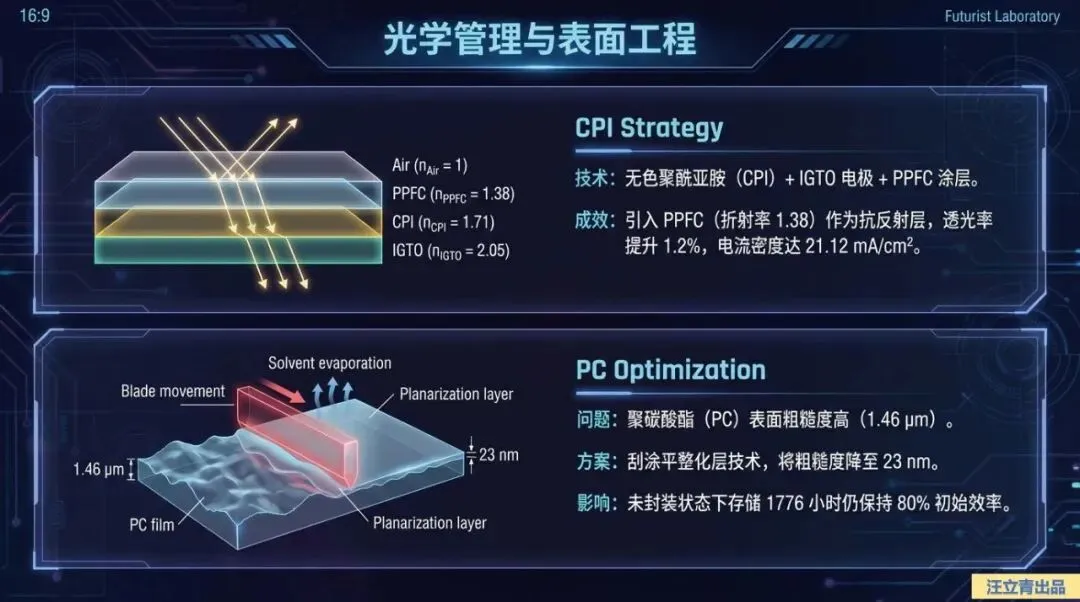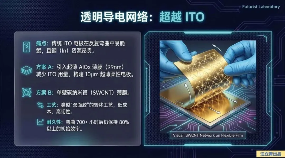 柔性基底(如PET、PEN、PI等)面临耐高温性差、表面粗糙及透光率限制等问题。研究人员通过引入抗反射涂层、平坦化层以及紫外下转换材料(如2Cz2tCzBn)来优化基底的光学和机械性能,。针对传统ITO电极脆性大且成本高的问题,文章介绍了超薄氧化铝薄膜复合电极以及单壁碳纳米管(SWCNT)薄膜等替代方案,以提升器件的柔韧性并降低对稀有金属的依赖。