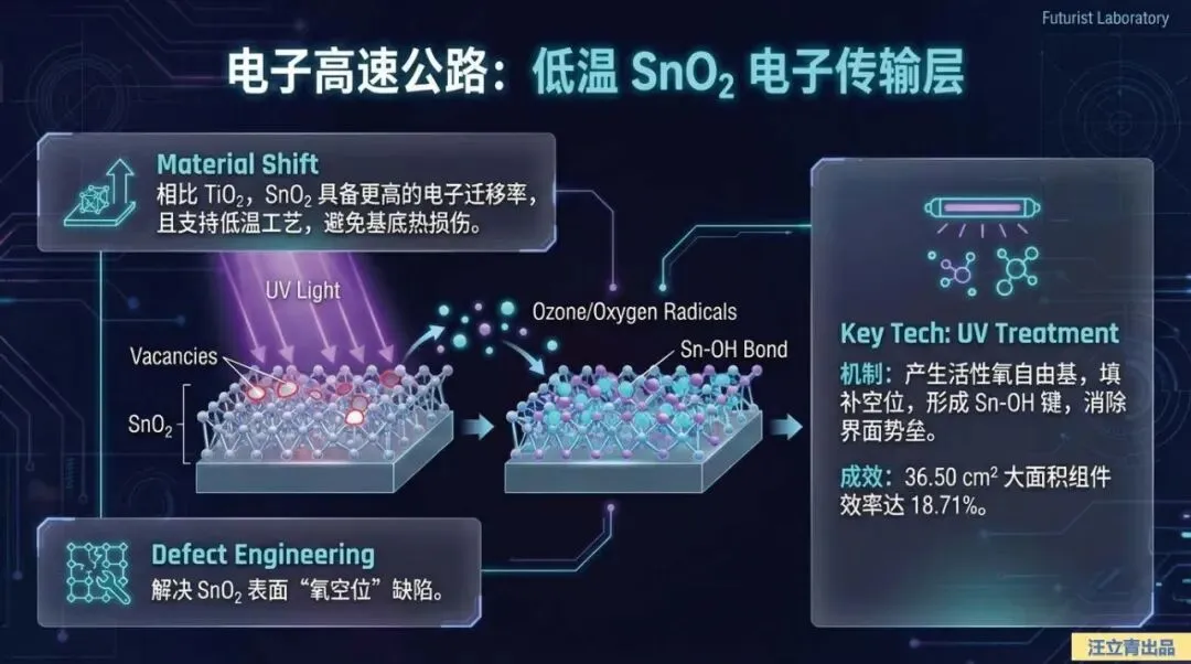 - 电子传输层(ETL): 重点关注低温制备工艺,如使用化学水浴法制备SnO2,并通过紫外光处理减少氧空位缺陷,实现了效率的突破,。