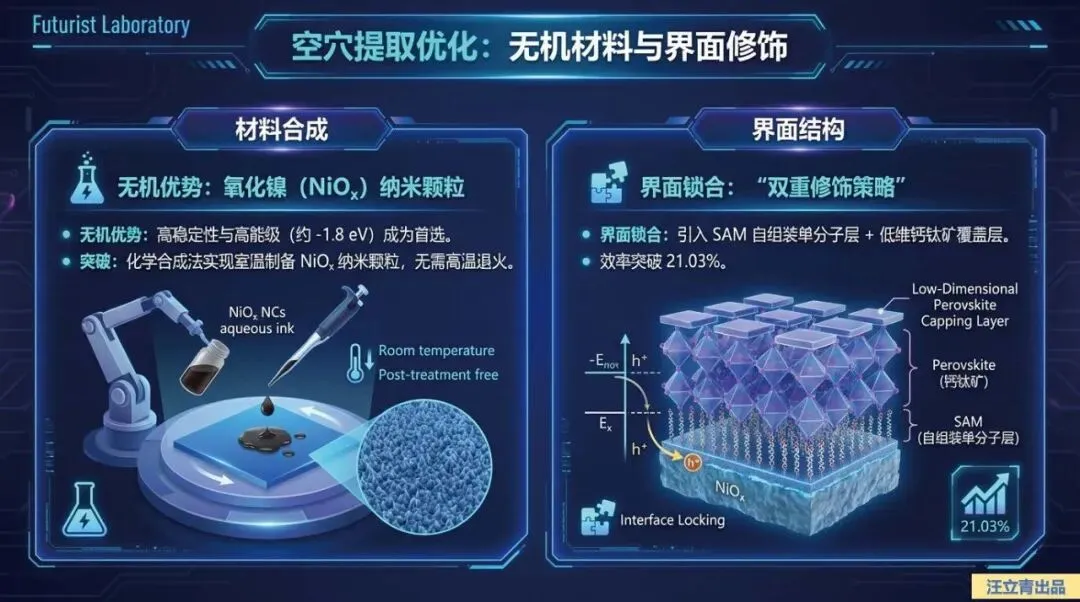 - 空穴传输层(HTL): 致力于开发低温制备的NiO及新型有机分子,通过双重修饰策略抑制界面缺陷,。