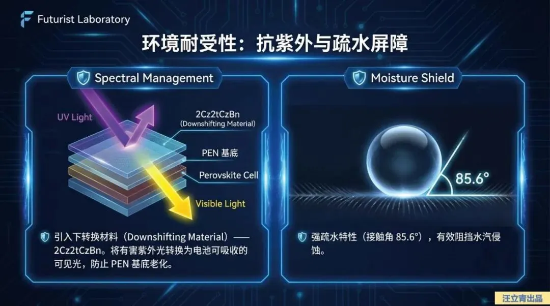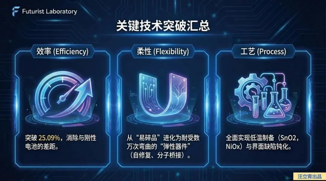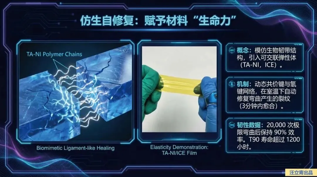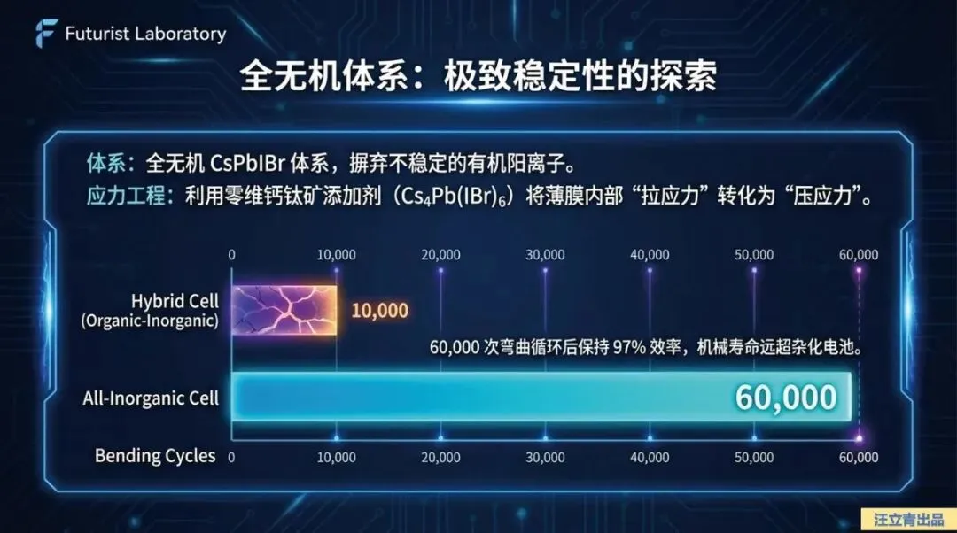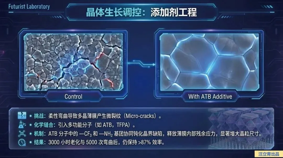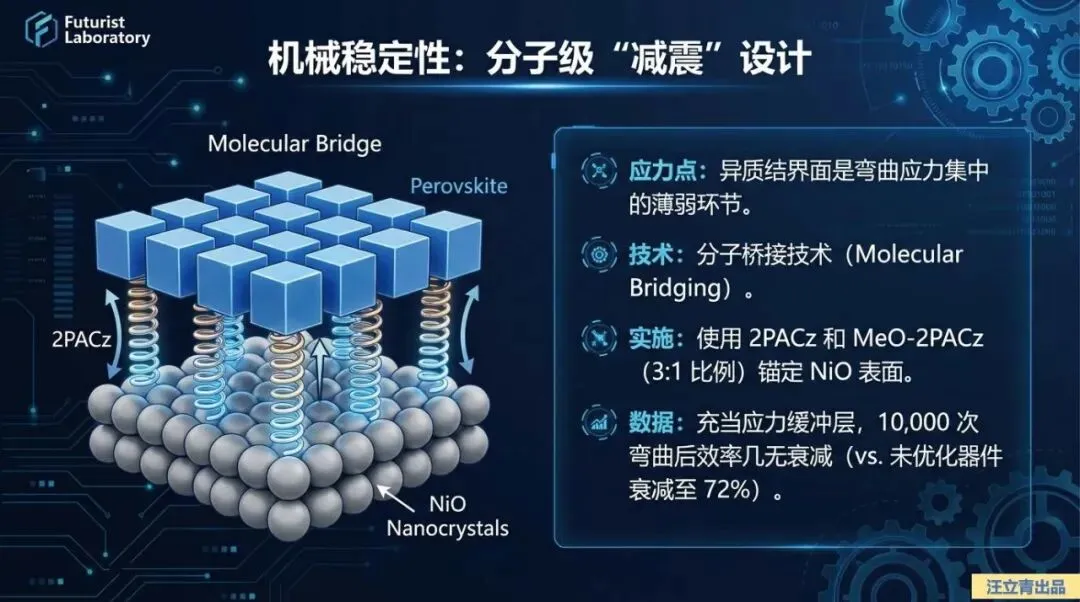 稳定性是限制FPSCs应用的主要瓶颈。为应对机械弯曲产生的裂纹及环境因素的影响,研究者采用了多种策略:利用分子桥接技术(如2PACz)锚定界面以增强抗弯曲能力;引入界面钝化材料(如HADI)改善接触;设计具有“韧带”结构的自修复聚合物(如TA-NI),使其在室温下能修复裂纹,显著提升了器件的机械稳定性和环境耐受性。