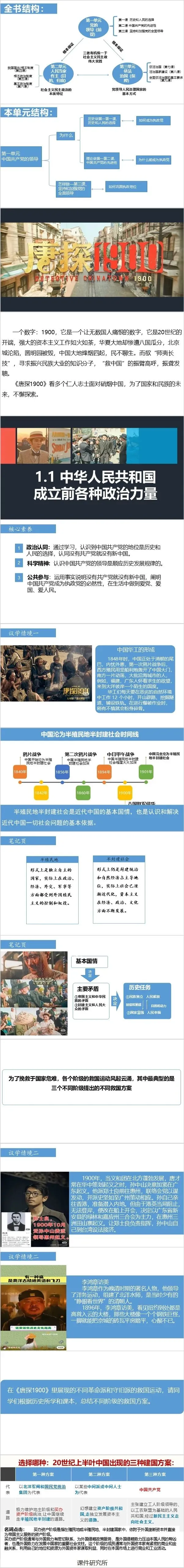 ①25年全新制作的1.1课件内容美化更升级,更有教材梳理,第一单元逻辑梳理等环节,帮助老师的更好备课,素材选用了春节档大热的《唐探1900》作为素材,一镜到底学习《中华人民共和国成立前的各种政治力量》。