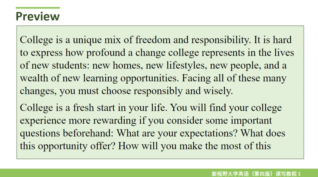 【新视野大学英语第四版】读写教程1(思政智慧版)(课件PPT+课文翻译+听力音频+习题答案)完整版--主编:郑树棠