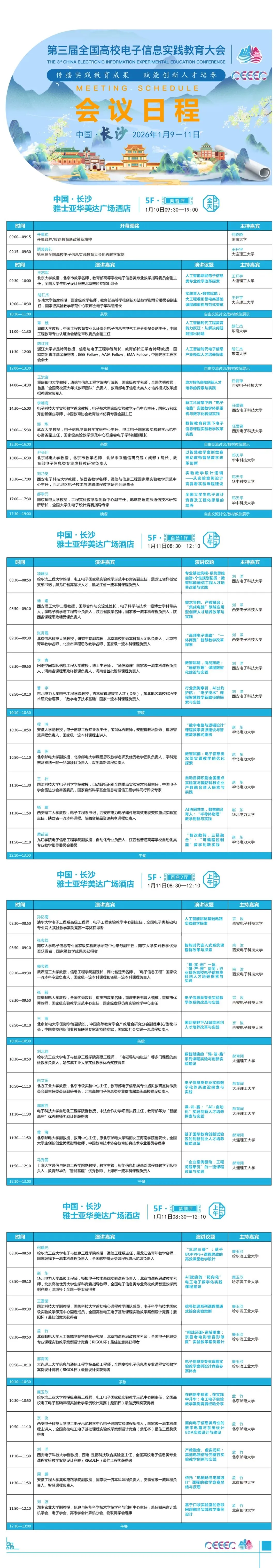教育部高等学校电子信息类专业教学指导委员会与高等学校国家级实验教学示范中心联席会电子学科组主办的“第三届全国高校电子信息实践教育大会”于2026年1月9―11日在长沙市成功召开。本届大会主题为“传播实践教育成果,赋能创新人才培养”,邀请电子信息学科领域专业负责人、实践教学负责人、创新创业负责人,分享优秀实践教育经验与成果。
