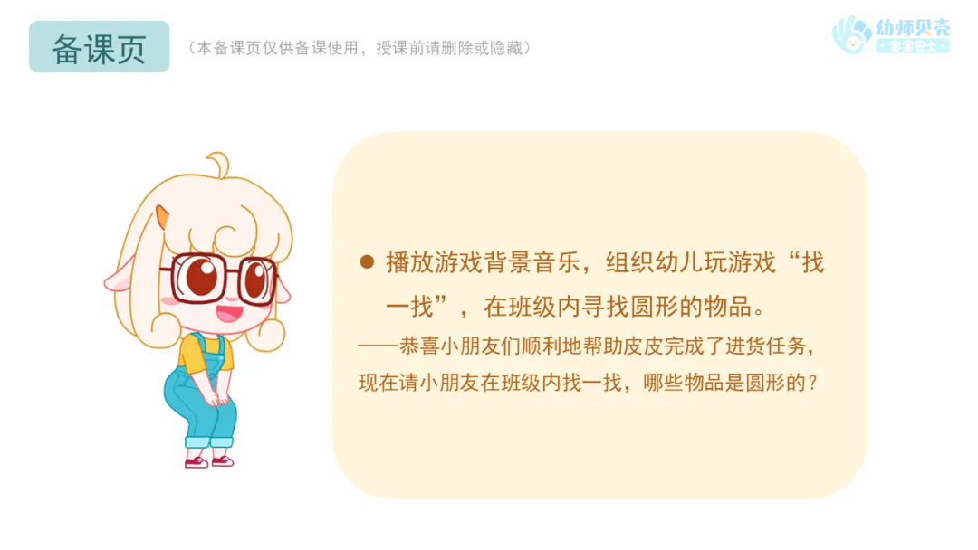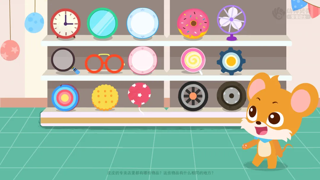 ——恭喜小朋友们顺利地帮助皮皮完成了进货任务,现在请小朋友在班级内找一找,哪些物品是圆形的?
