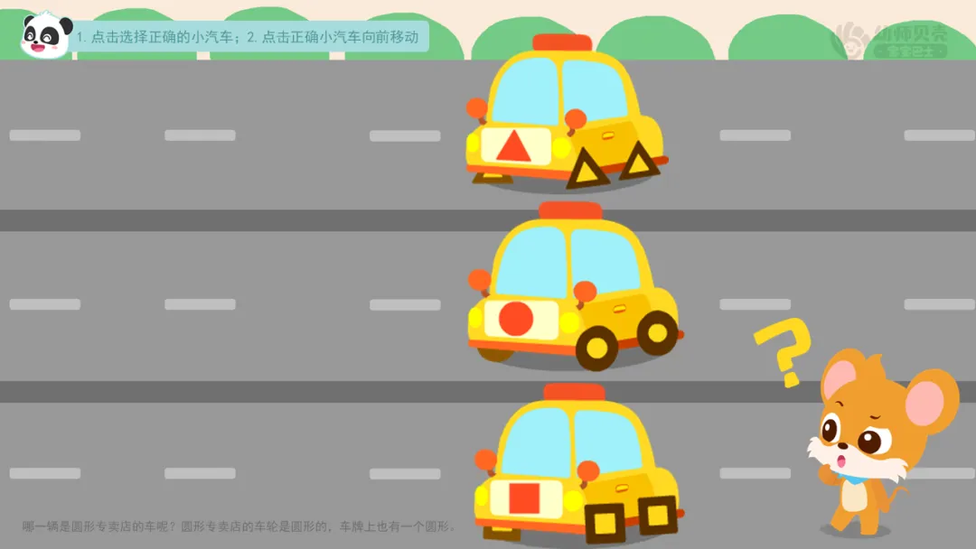 ——圆形专卖店的物品都卖完了,皮皮现在准备去进货。马路上停着3辆车,哪一辆小汽车是圆形专卖店的车呢?皮皮不记得了,他只记得小汽车的车轮是圆形的,车牌上也有一个圆形。