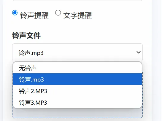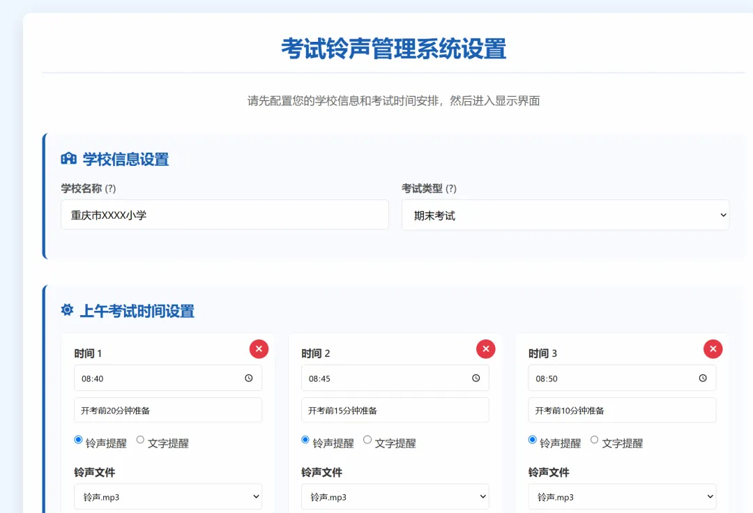 音频文件上传成功后,在铃声文章里会增加三个下拉框。这样就能给每一个时间节点设置不同的声音。做一个显示系统时间的网页,内容是重庆市XX小学的考试铃声管理系统,具体要求如下: