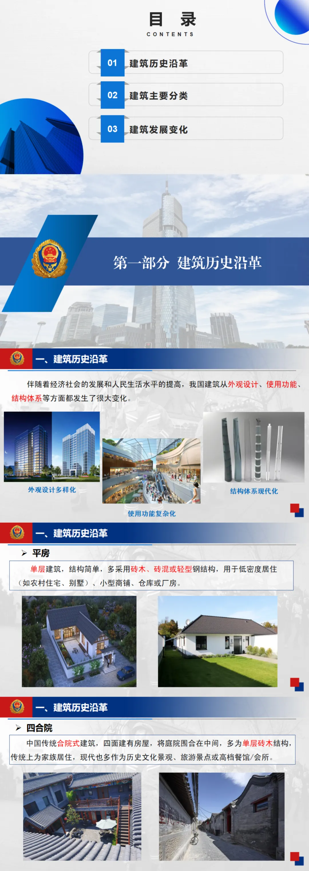 本课件系统介绍了建筑的历史沿革、主要分类、发展变化以及设防理念和防火技术,重点分析了现代建筑在高度、材料、结构、类型、火灾荷载、设防标准和消防系统等方面的变化,为建筑防火设计和灭火救援提供基础知识。