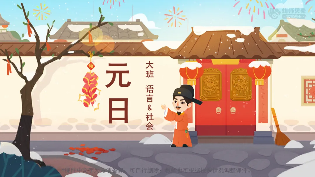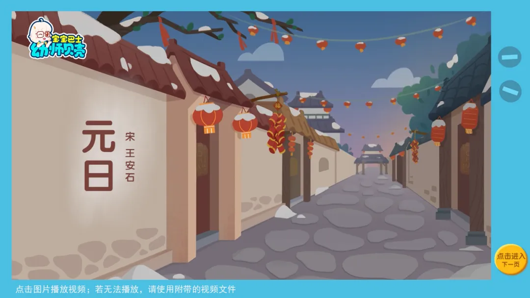 ——刚刚小朋友们说了很多过年的习俗,其实这些习俗都是从古代流传下来的。古代的新年是什么样的呢?诗人王安石写了一首关于新年的诗,叫《元日》,我们一起去诗里找找答案吧。