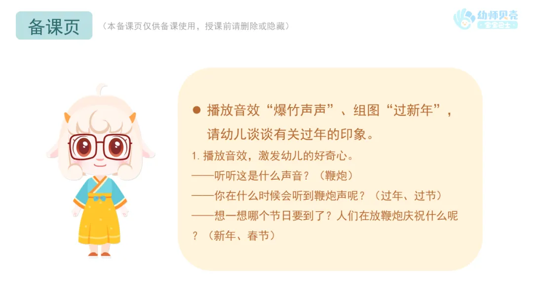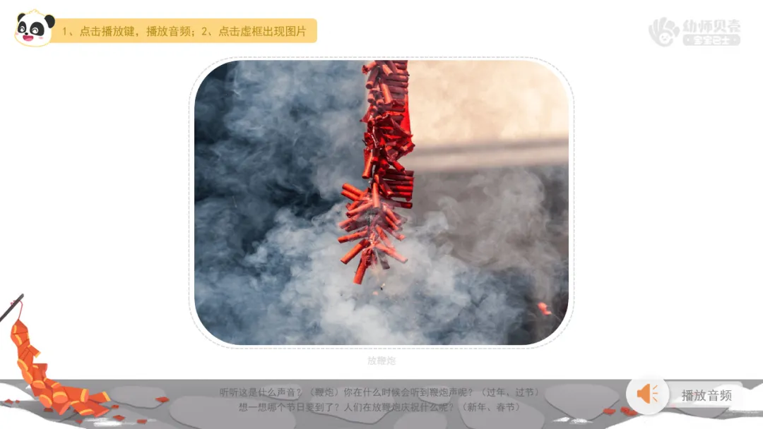 l播放音效“爆竹声声”、组图“过新年”,请幼儿谈谈有关过年的印象。