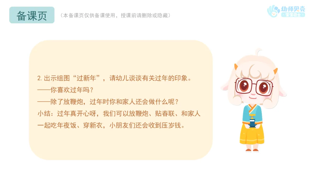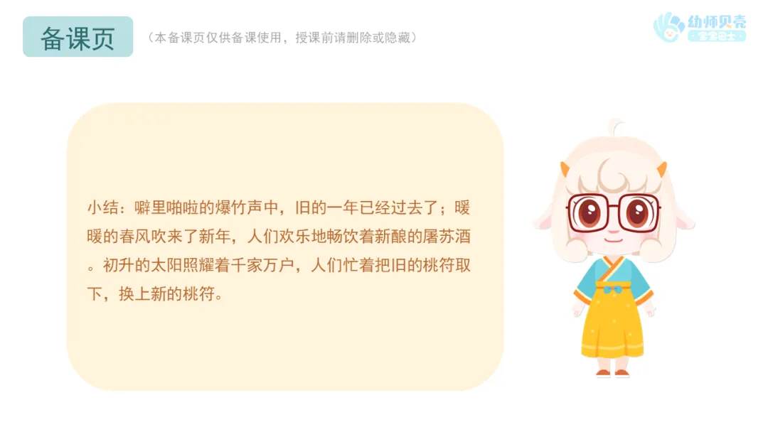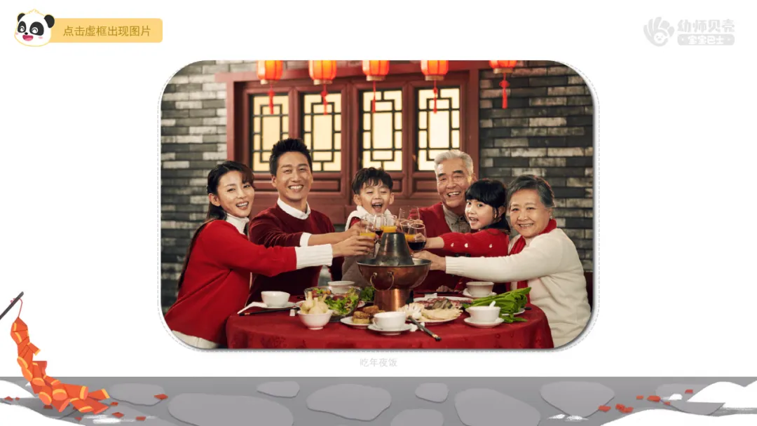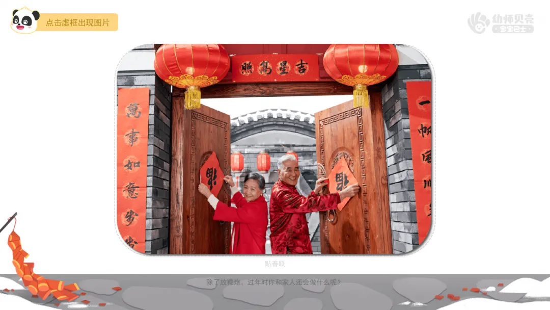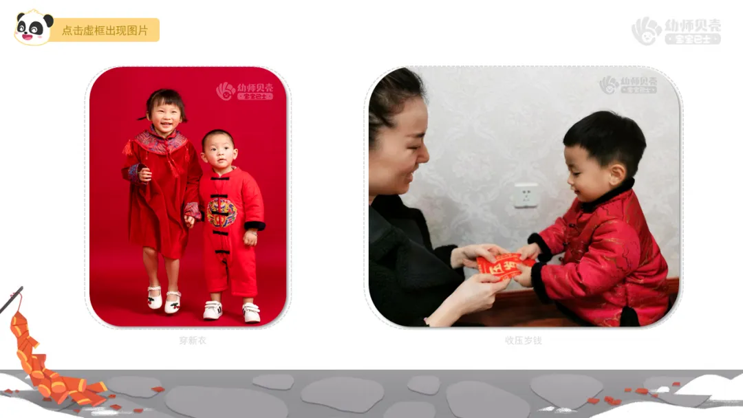 小结:过年真开心呀,我们可以放鞭炮、贴春联、和家人一起吃年夜饭、穿新衣,小朋友们还会收到压岁钱。