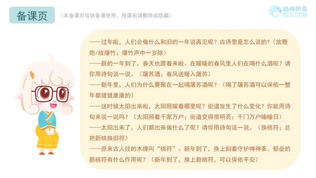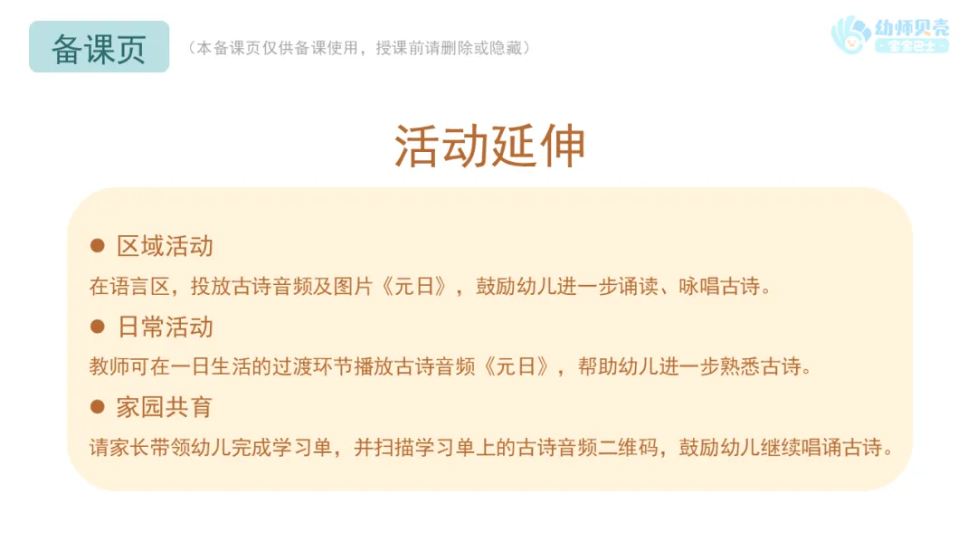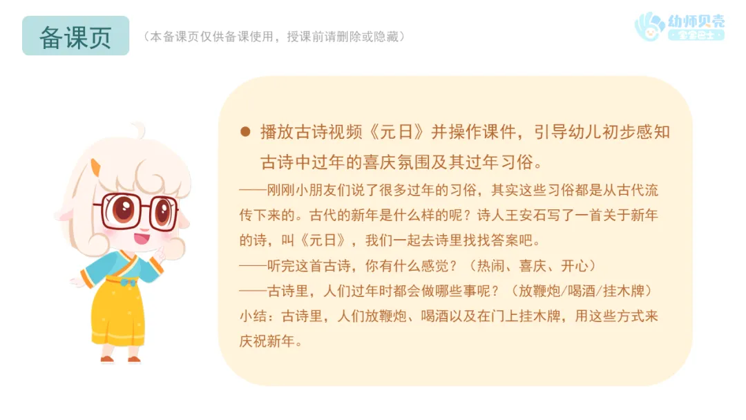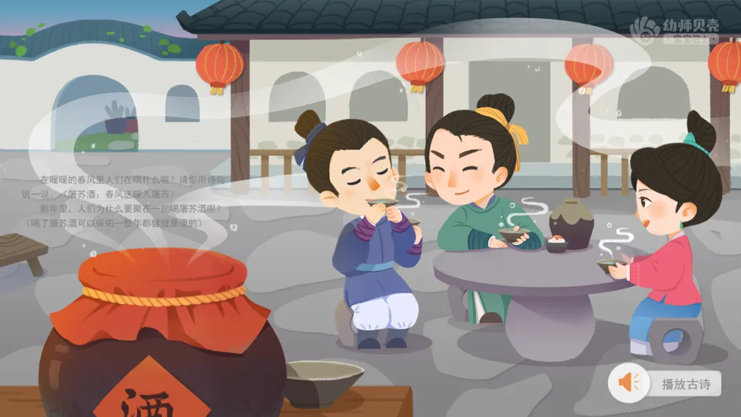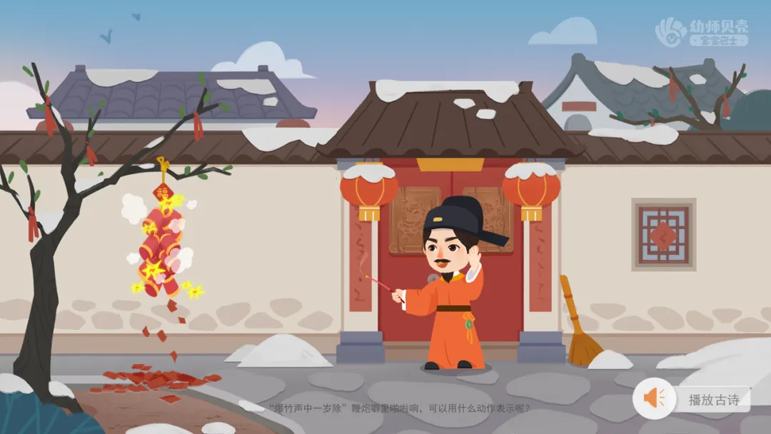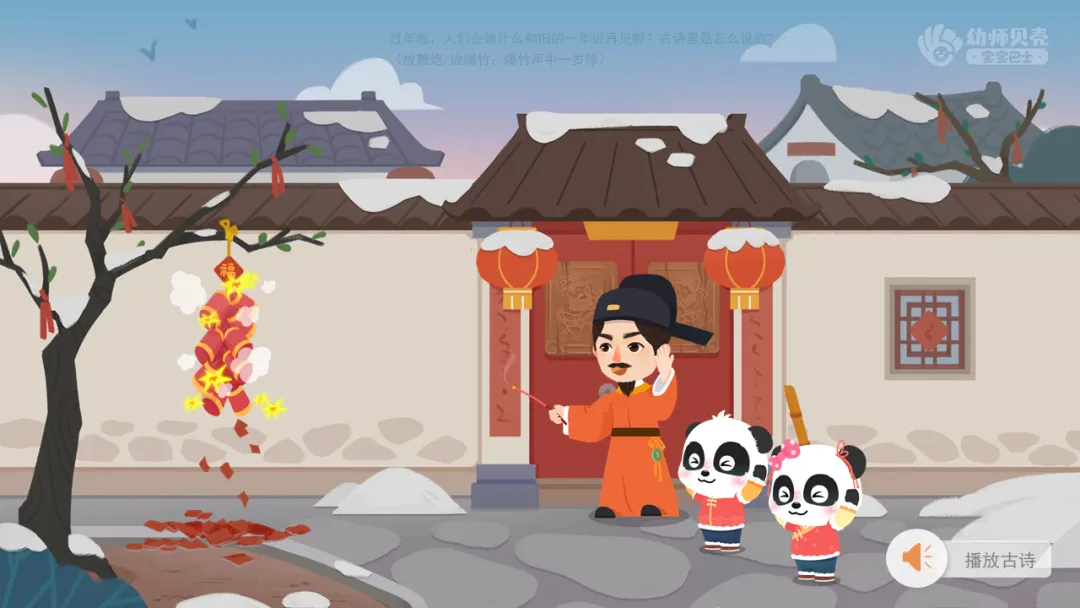 教师可在一日生活的过渡环节播放古诗音频《元日》,帮助幼儿进一步熟悉古诗。