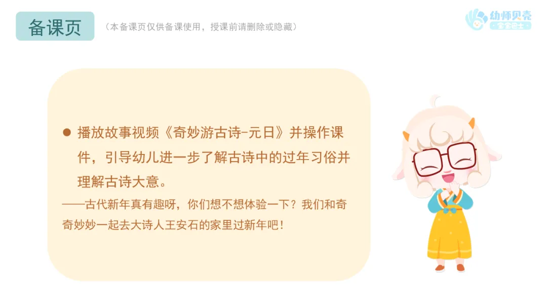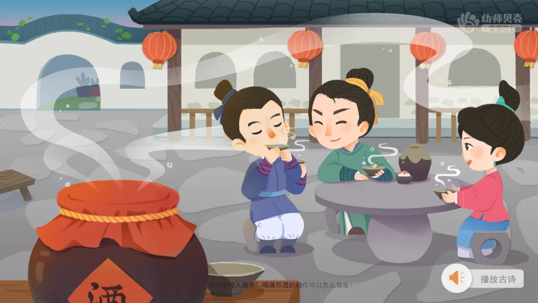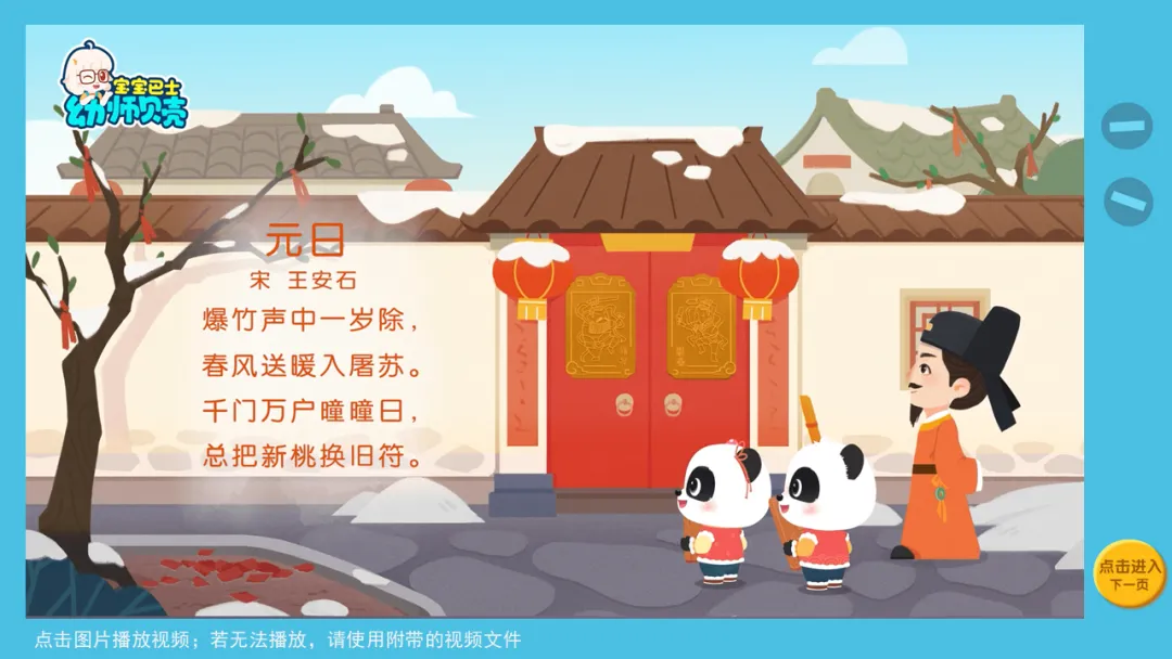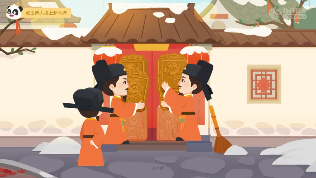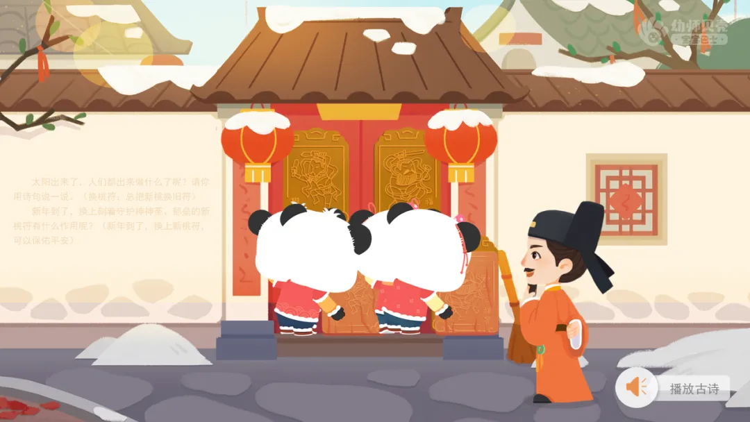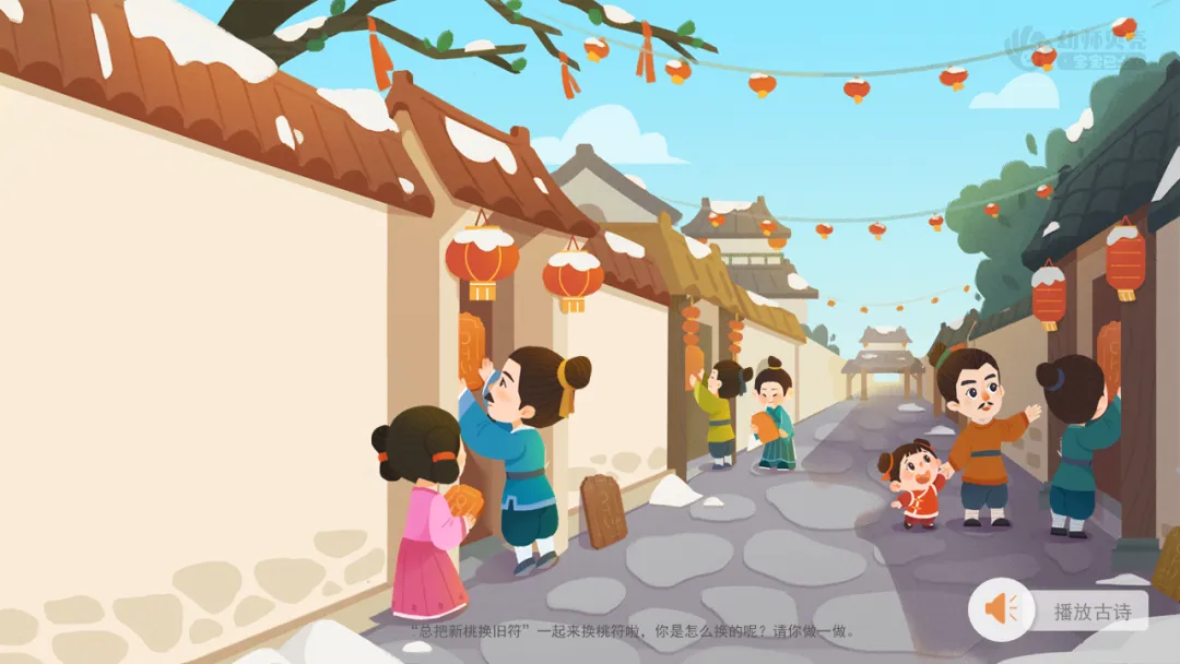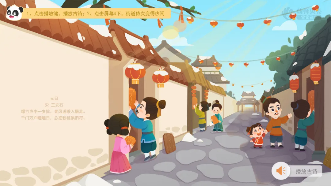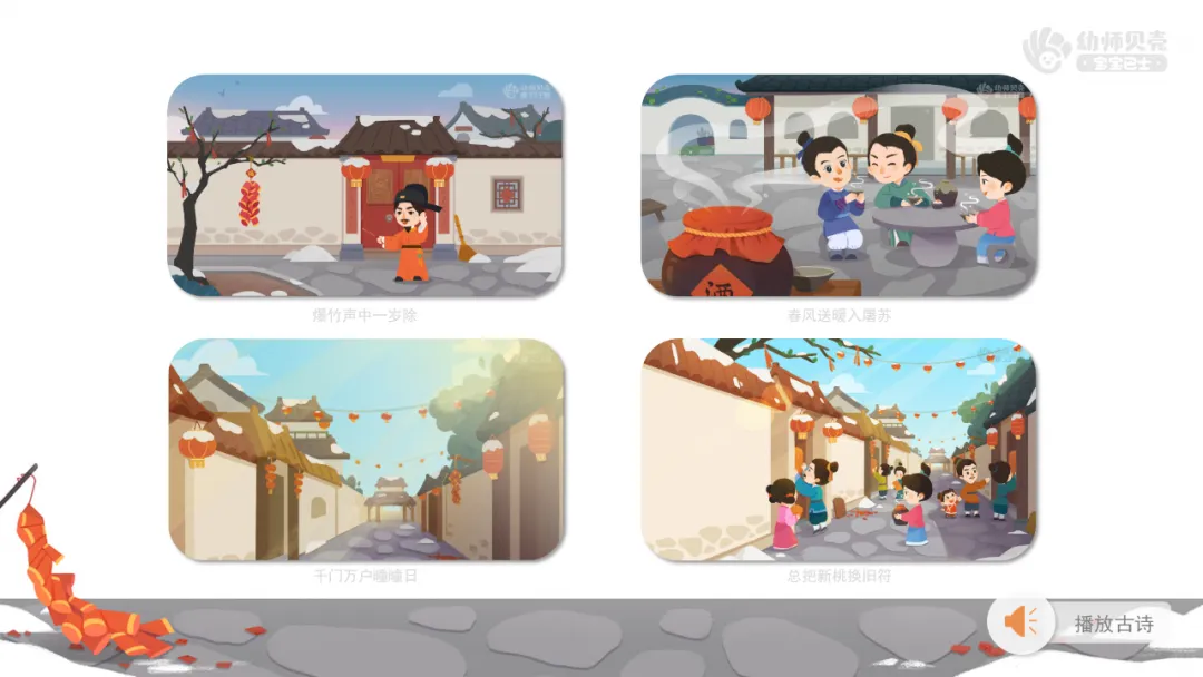 l播放故事视频《奇妙游古诗-元日》并操作课件,引导幼儿进一步了解古诗中的过年习俗并理解古诗大意。