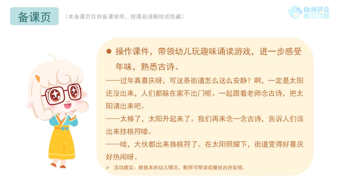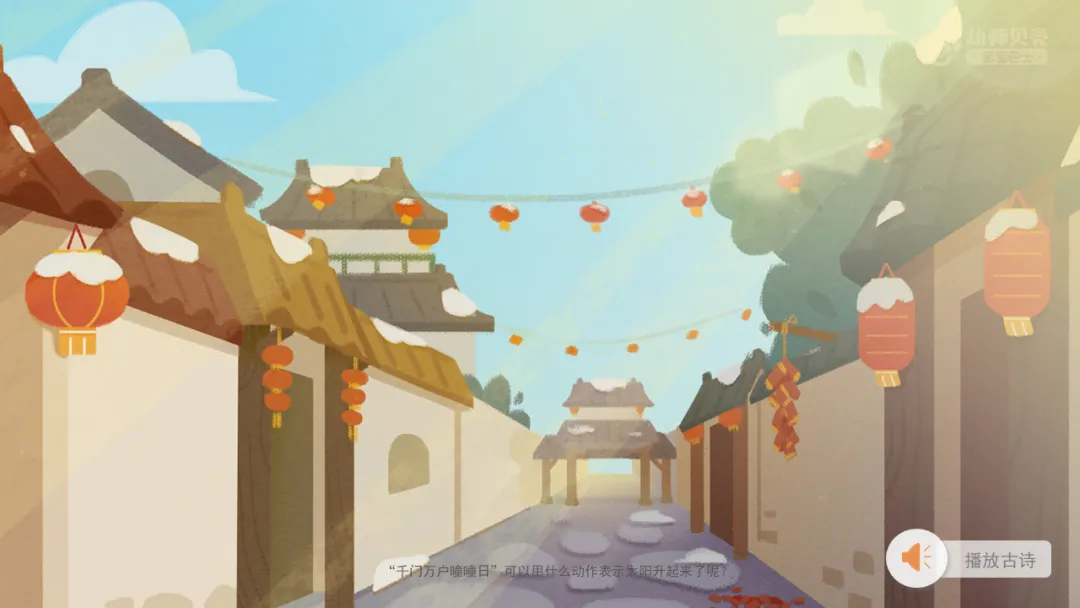 ——过年真喜庆呀,可这条街道怎么这么安静?啊,一定是太阳还没出来,人们都躲在家不出门呢。一起跟着老师念古诗,把太阳请出来吧。