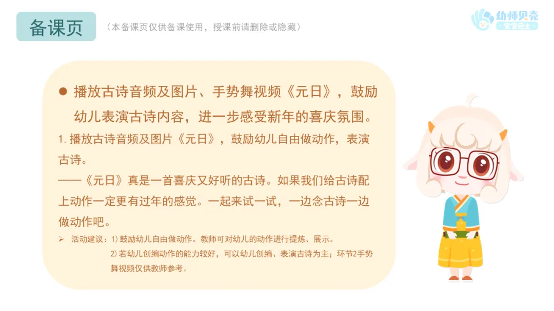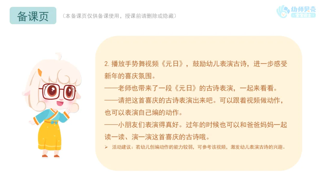 2)若幼儿创编动作的能力较好,可以幼儿创编、表演古诗为主;环节2手势舞视频仅供教师参考。