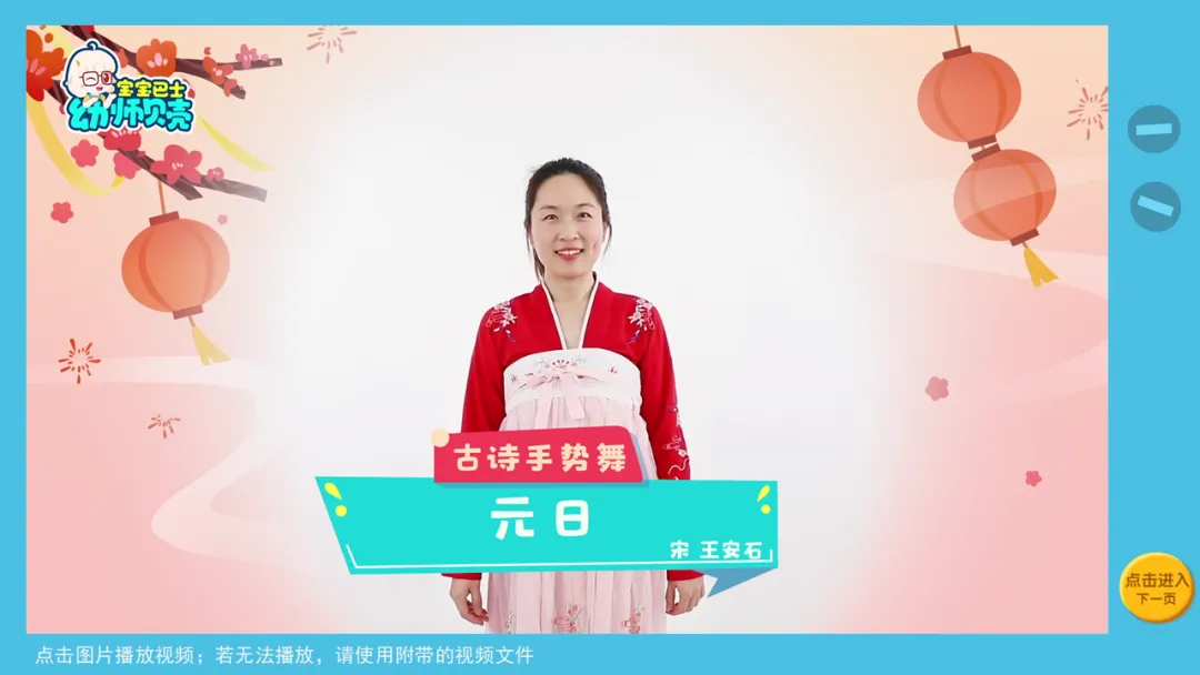 l播放古诗音频及图片、手势舞视频《元日》,鼓励幼儿表演古诗内容,进一步感受新年的喜庆氛围。