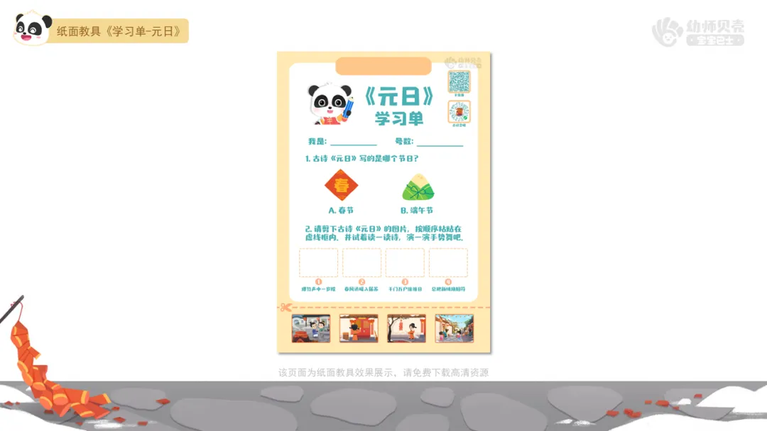 l播放古诗视频《元日》并操作课件,引导幼儿初步感知古诗中过年的喜庆氛围及其过年习俗。