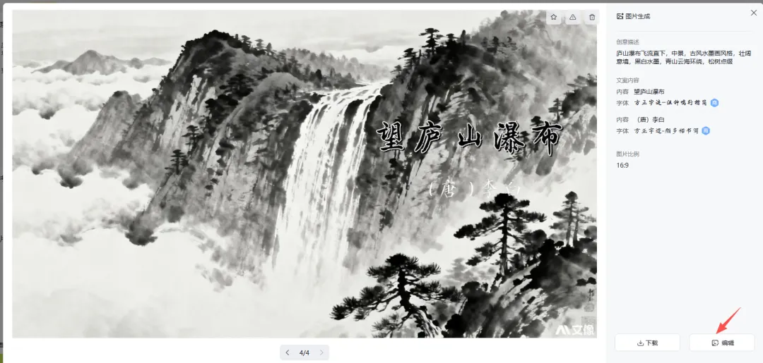 需求:制作《望庐山瀑布》古诗课件配图,水墨国风风格,贴合 “飞流直下三千尺” 的壮阔意境