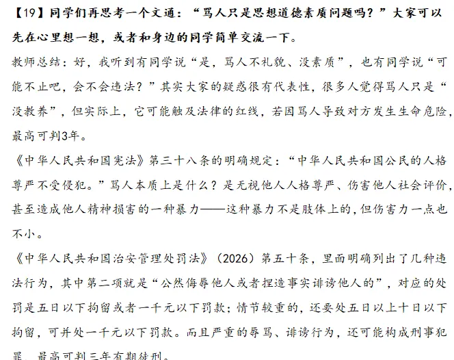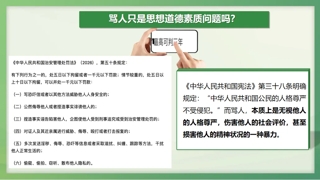 绪论部分共包含课件84页,逐字稿约2万字。其中案例包括如下:对扶不扶的解析;骂人是否违法?