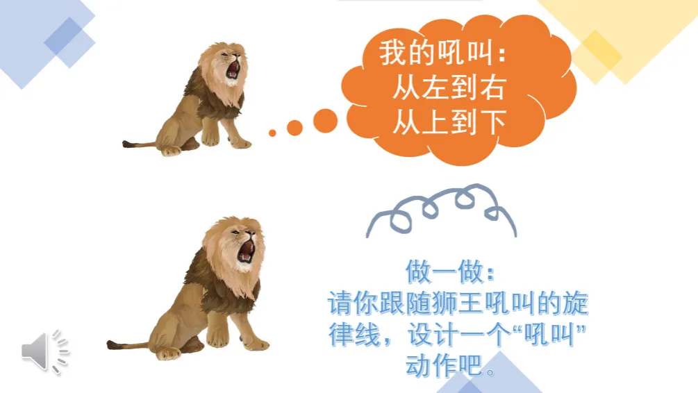 师:狮王吼叫了四声,你能仔细观察找到旋律线的方向吗?现在,请你跟随旋律线,设计一个吼叫的动作吧。教师引导学生观察旋律线的方向是从左往右,从上到下。设计动作时,狮王也应当按照旋律线条的方向进行吼叫(下图:动作设计——抽象的旋律形象化)。