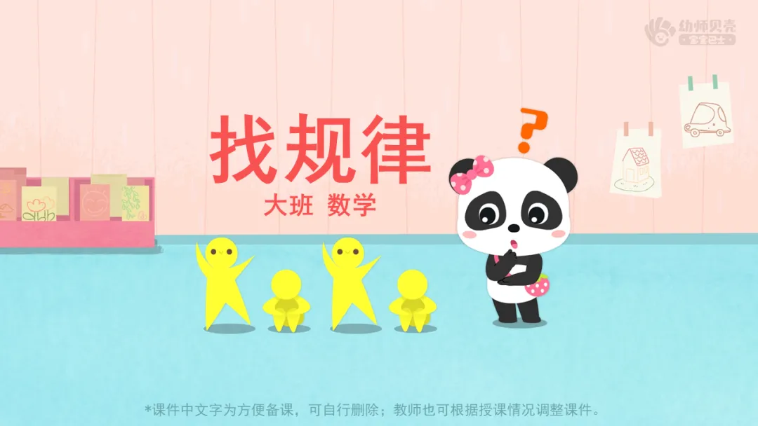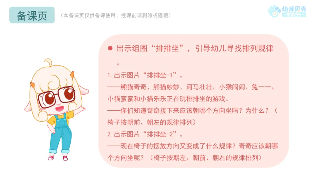 l出示组图“排排坐”,引导幼儿寻找排列规律。