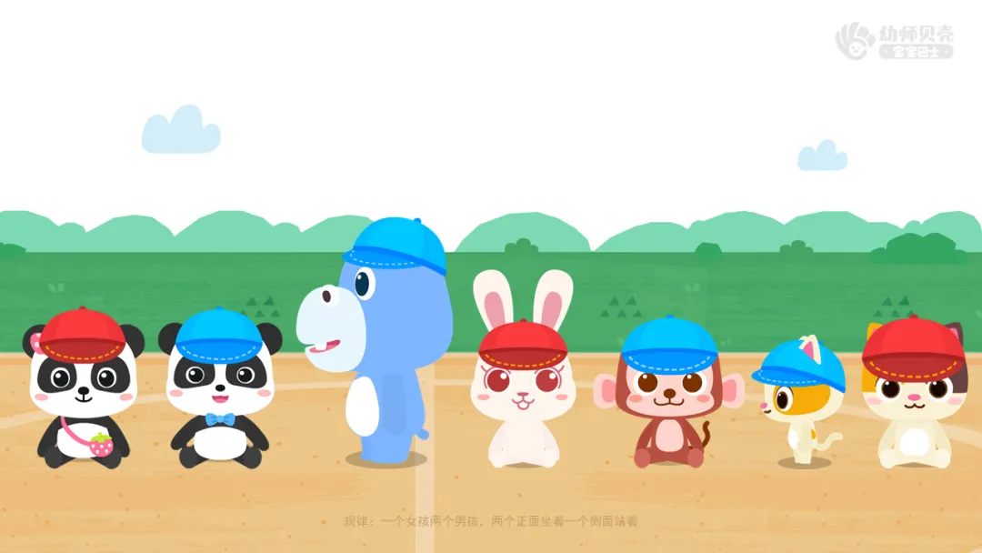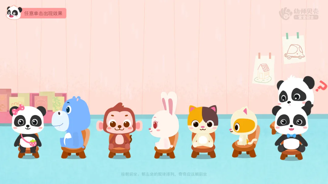 ——熊猫奇奇、熊猫妙妙、河马壮壮、小猴闹闹、兔一一、小猫蜜蜜和小猫乐乐正在玩排排坐的游戏。