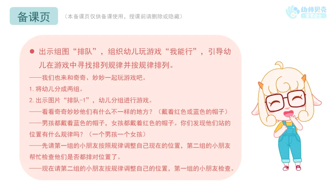 ——先请第一组的小朋友按照规律调整自己现在的位置,第二组的小朋友帮忙检查他们是否都排对位置了。