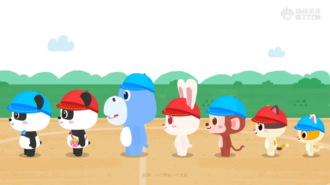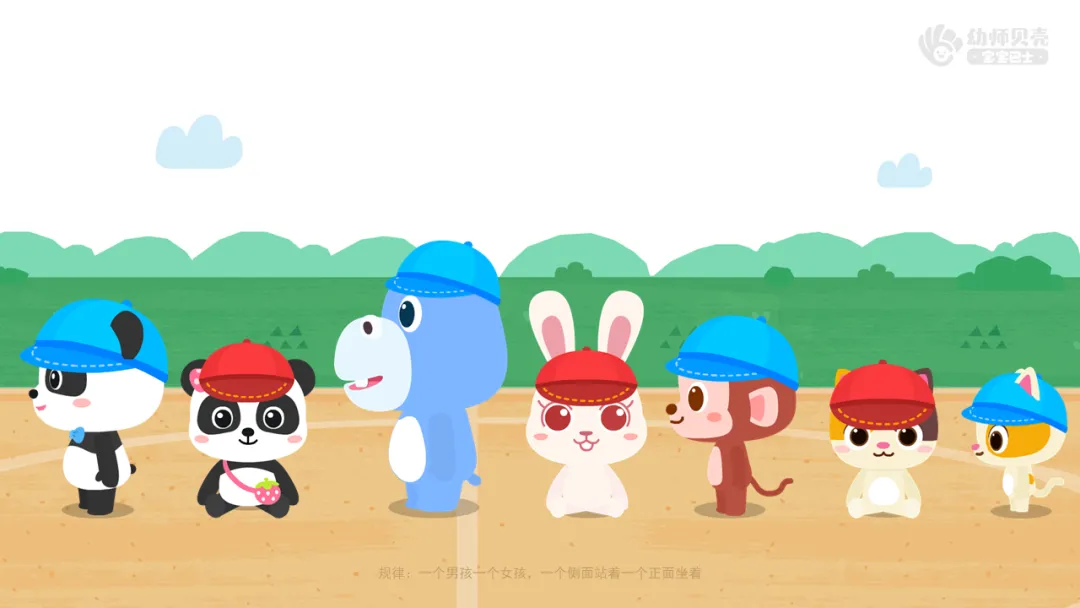 ——男孩都戴着蓝色的帽子,女孩都戴着红色的帽子。你们发现他们站的位置有什么规律吗?(一个男孩一个女孩)