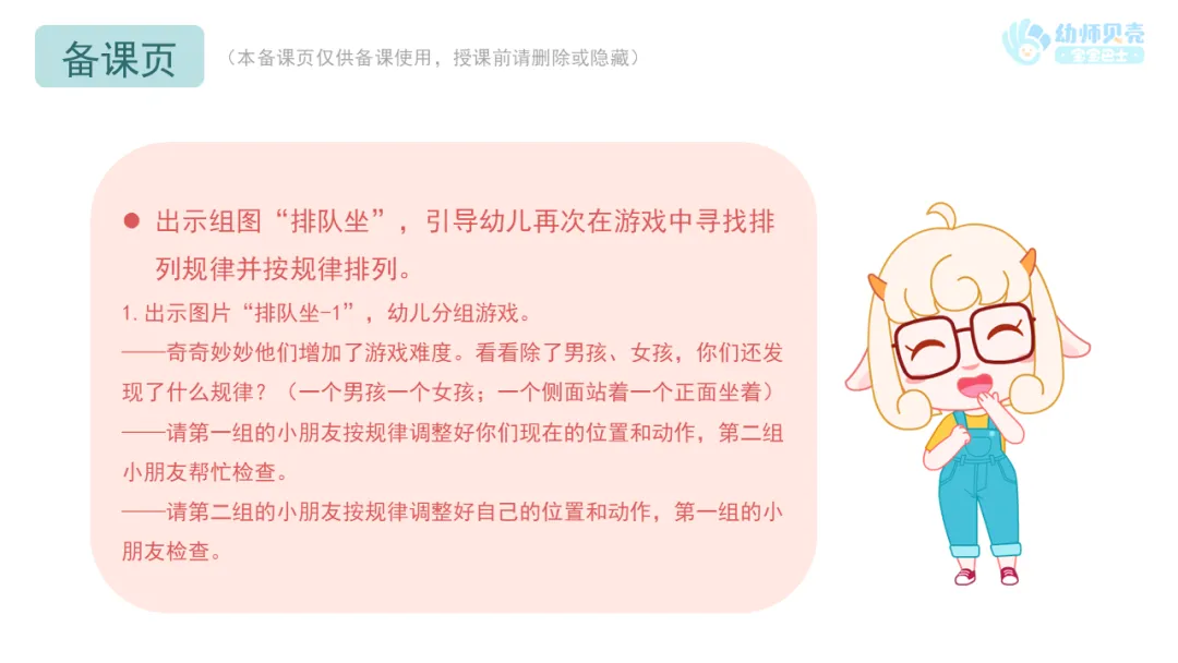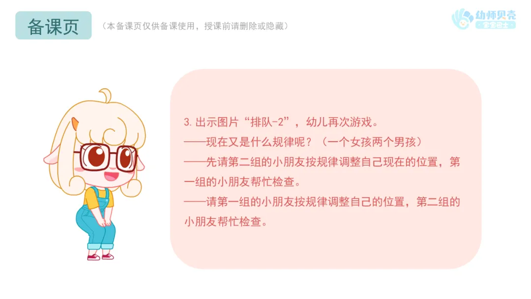 ——请第一组的小朋友按规律调整自己的位置,第二组的小朋友帮忙检查。