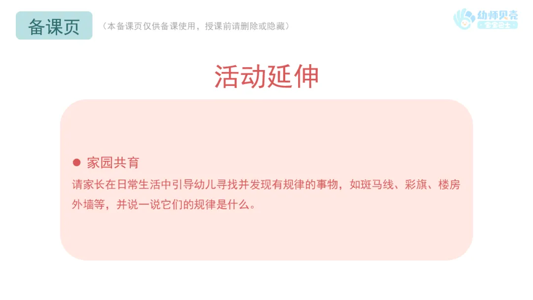 请家长在日常生活中引导幼儿寻找并发现有规律的事物,如斑马线、彩旗、楼房外墙等,并说一说它们的规律是什么。