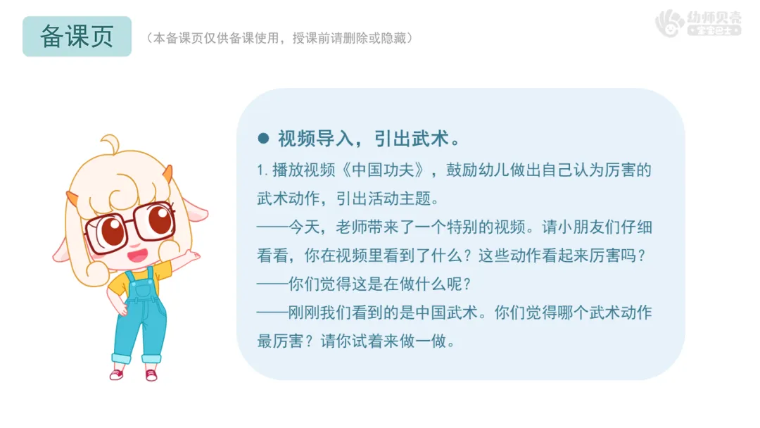 l经验准备:幼儿观看过和武术相关的影视剧或动画片。